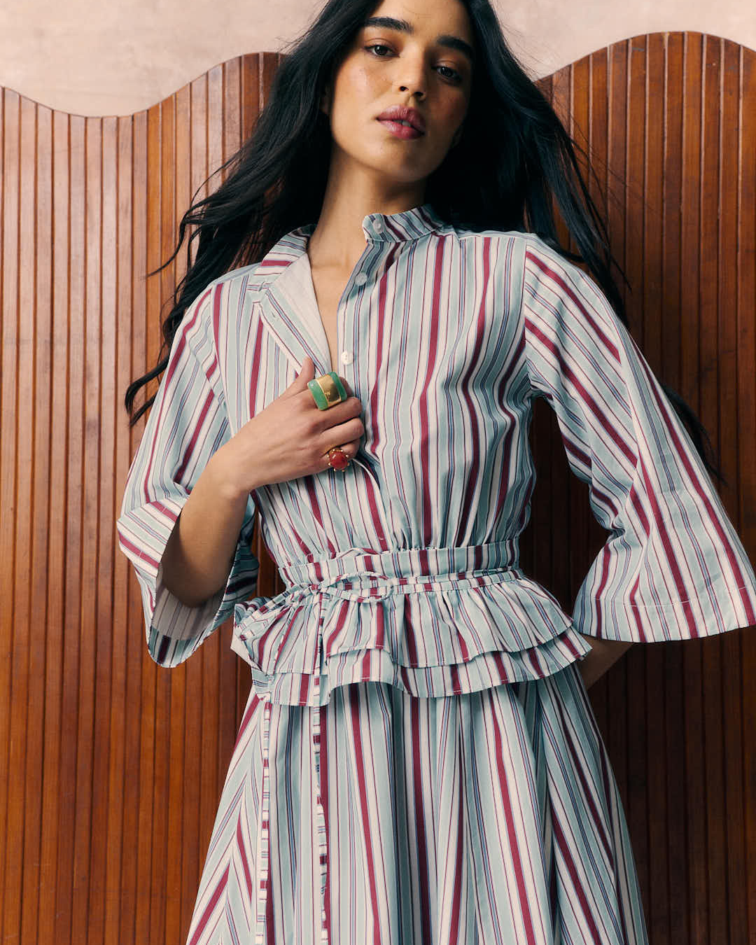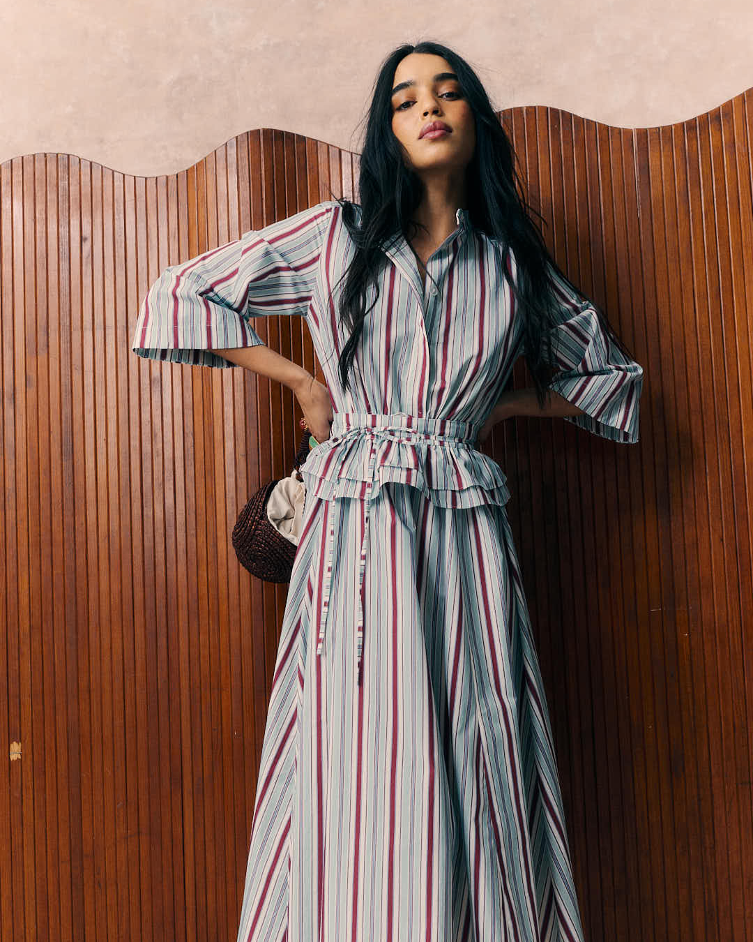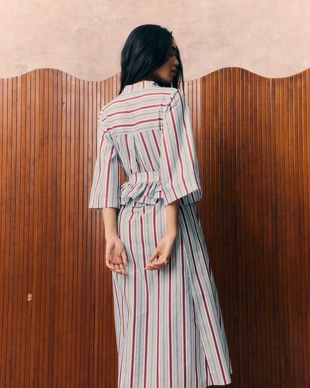 Details That Make the Difference: This midi dress features ¾ flared sleeves, a mandarin collar, and a drawstring waist to flatter the figure. Its exquisite design includes a ruffled sash that makes the dress truly one-of-a-kind. Its combination of elegance and quality makes it a unique and unforgettable choice. Made from the finest quality cotton, lightweight and flowing, this dress guarantees comfort and breathability every time you wear it. Its original print was designed by us, making it even more special. It features a striped pattern in shades of brown, blue, yellow, and orange, a color combination that won’t go unnoticed!