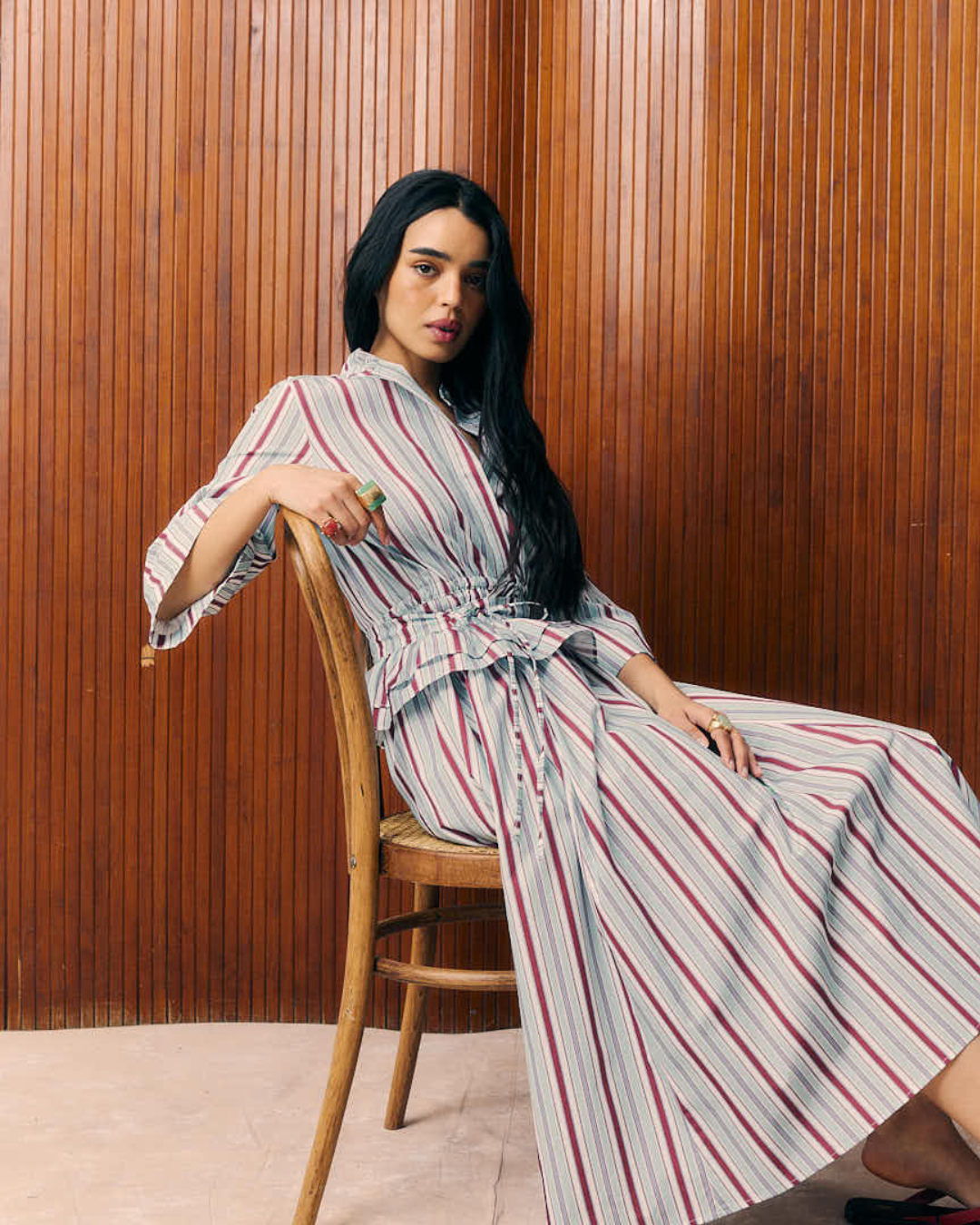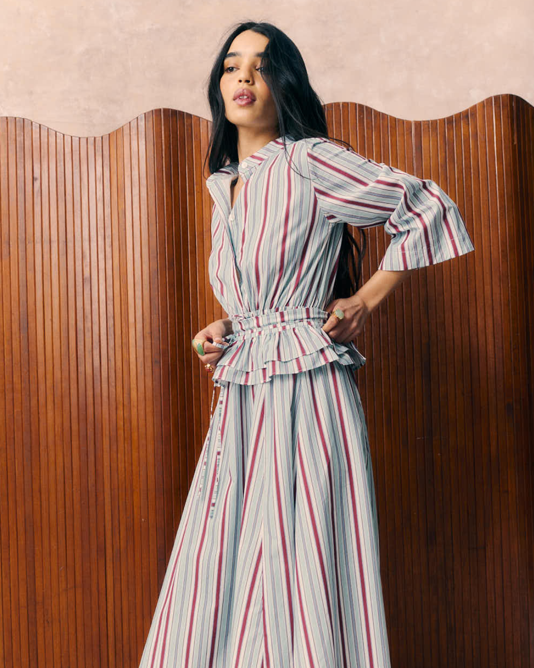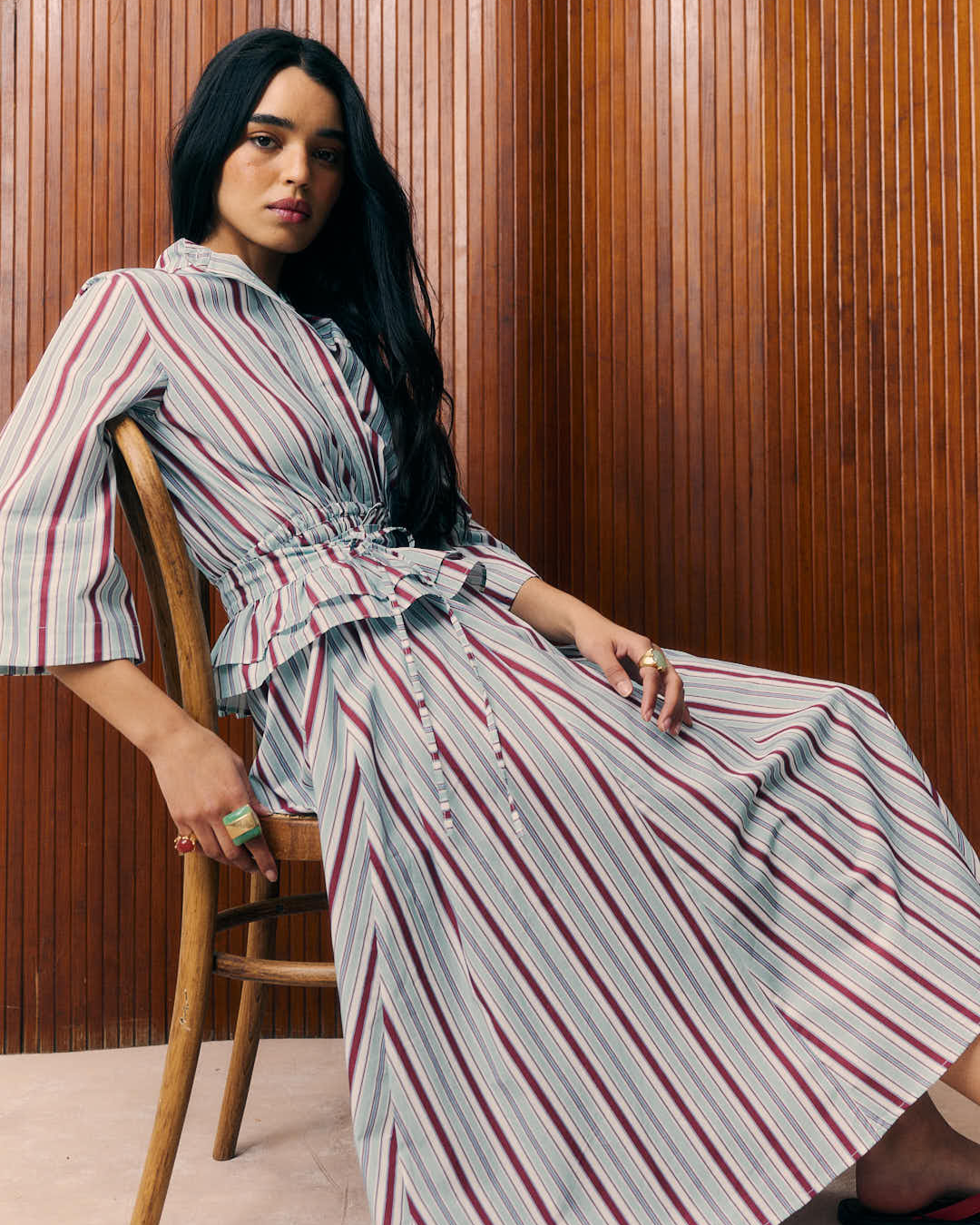 Details That Make the Difference: This midi dress features ¾ flared sleeves, a mandarin collar, and a drawstring waist to flatter the figure. Its exquisite design includes a ruffled sash that makes the dress truly one-of-a-kind. Its combination of elegance and quality makes it a unique and unforgettable choice. Made from the finest quality cotton, lightweight and flowing, this dress guarantees comfort and breathability every time you wear it. Its original print was designed by us, making it even more special. It features a striped pattern in shades of brown, blue, yellow, and orange, a color combination that won’t go unnoticed!