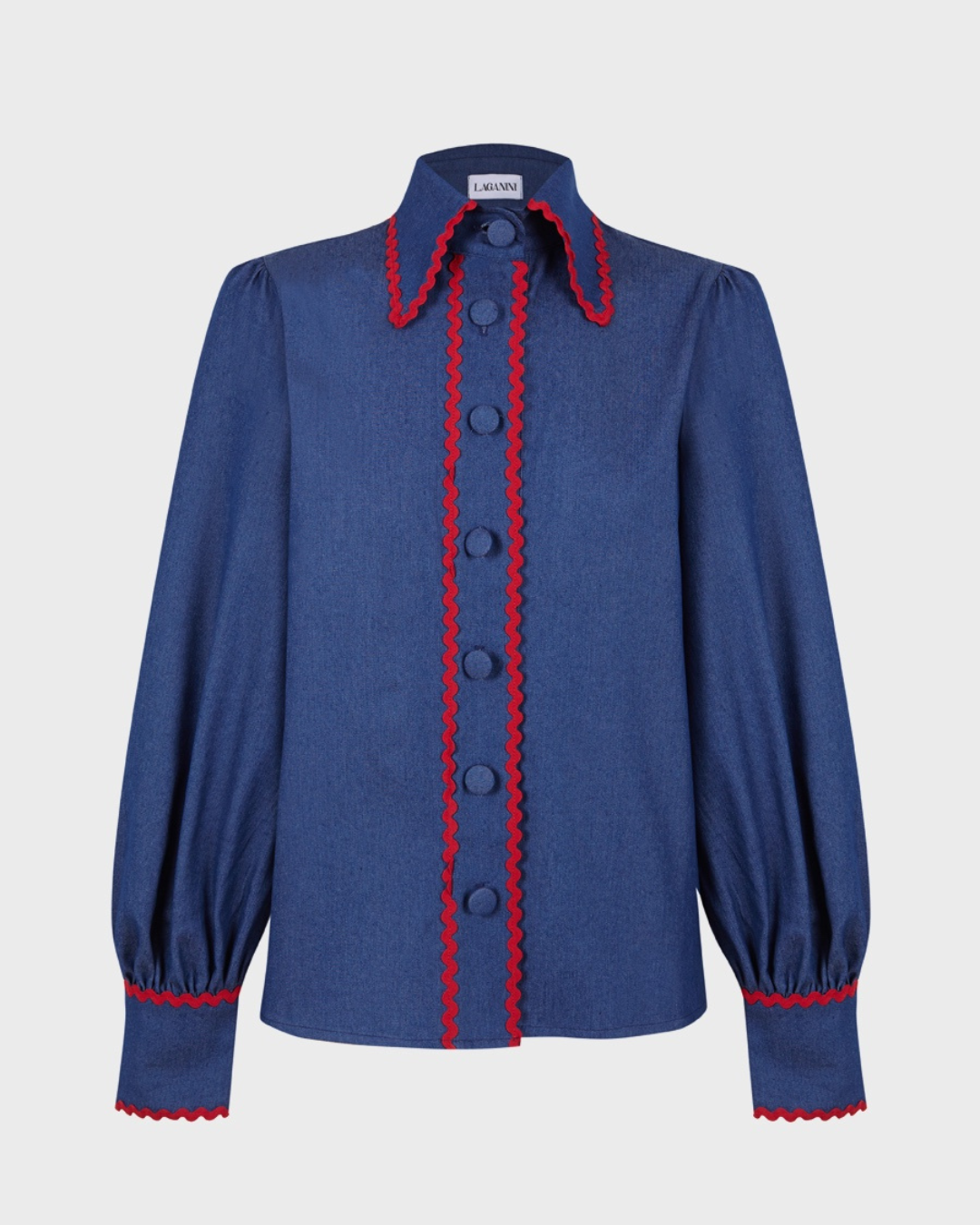 Details that make the difference: Made from fashionable denim fabric and featuring red ondulina trim, the Carrie Denim Shirt stands out for its uniqueness. Designed for both everyday wear and your most special events, this shirt with a structured collar with a retro touch, puffed sleeves at the shoulders and cuffs, and hand-sewn covered buttons will attract everyone’s attention. It also features a special yoke at the back and a crossover front that stand out thanks to the use of ondulina in the most special details.