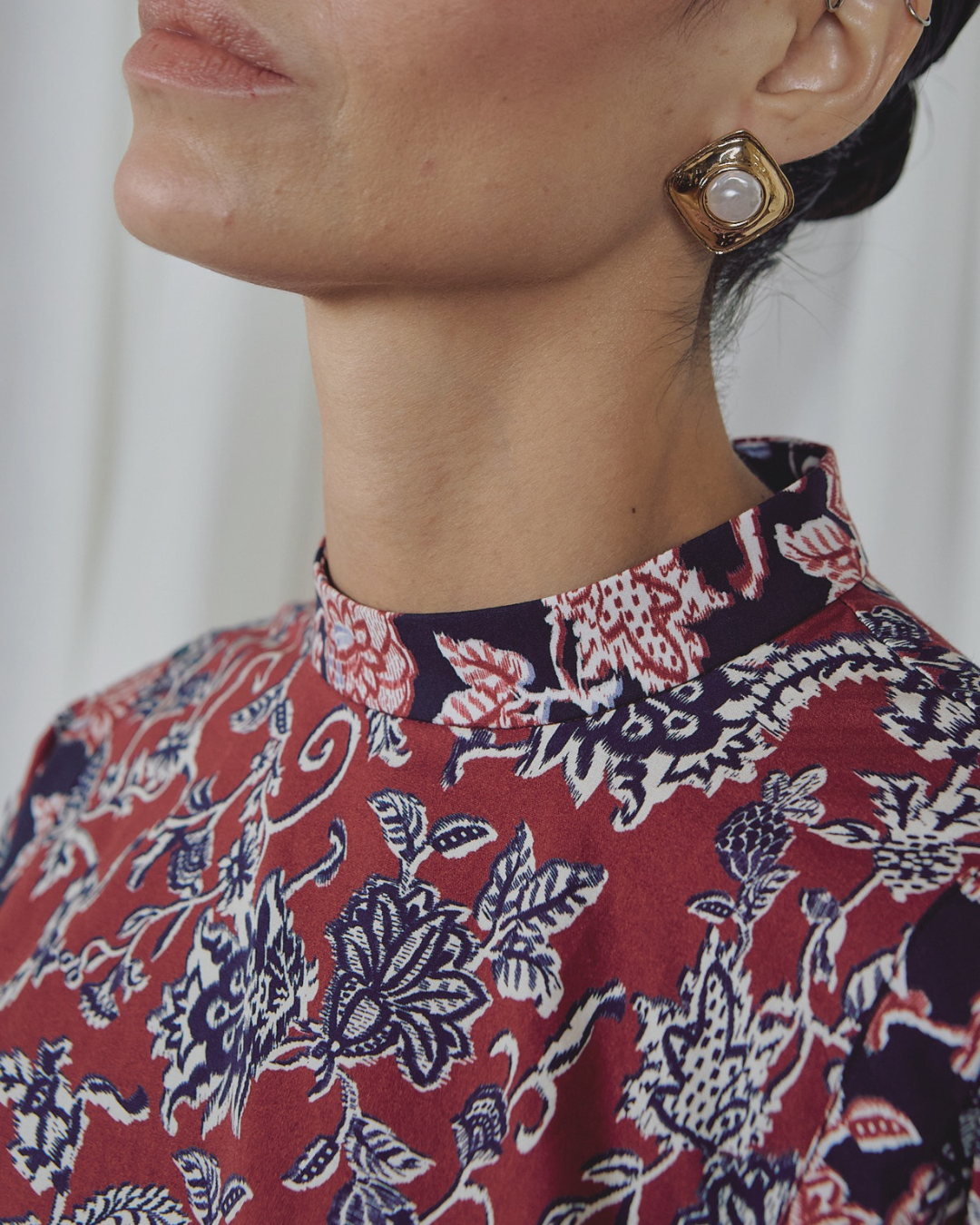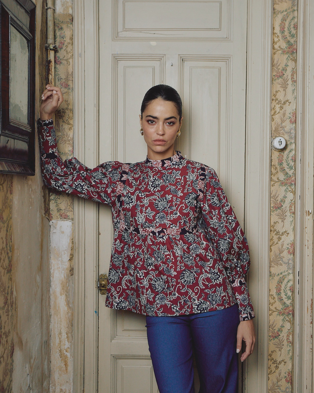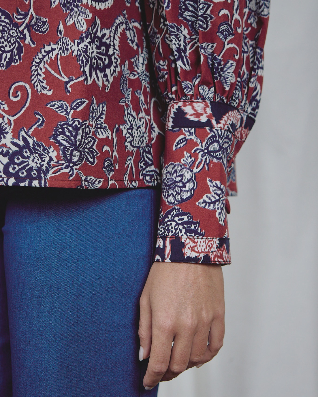 Details that Make the Difference: The new Clotilde Norfolk Red shirt is characterized by its pattern that fits all body types and its exquisite combined print. This fabric is classic and versatile, but also suitable for any occasion. This exclusive and discreet floral print is designed in two versions, both with a color palette that includes maroon, red, and white. It is designed by the Laganini team and gives the blouse a boho, sophisticated and feminine feel. Details such as the high collar, low chest cut, covered and hand-sewn buttons and, above all, the contrasting trim on the collar, front and cuffs are what make this shirt the most special of the season.