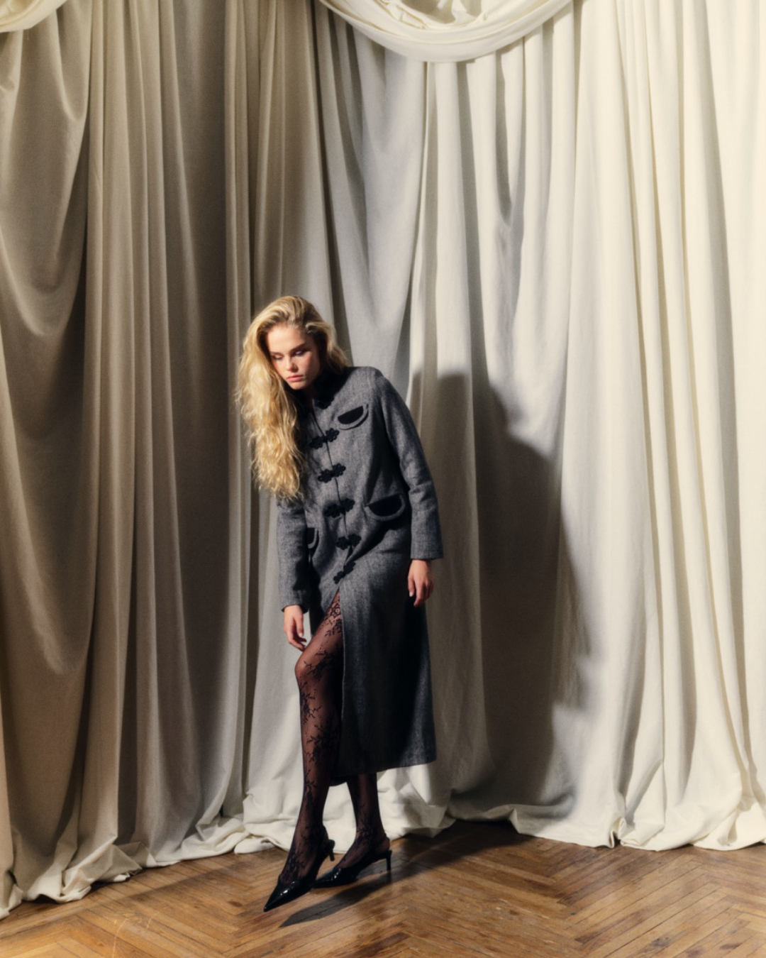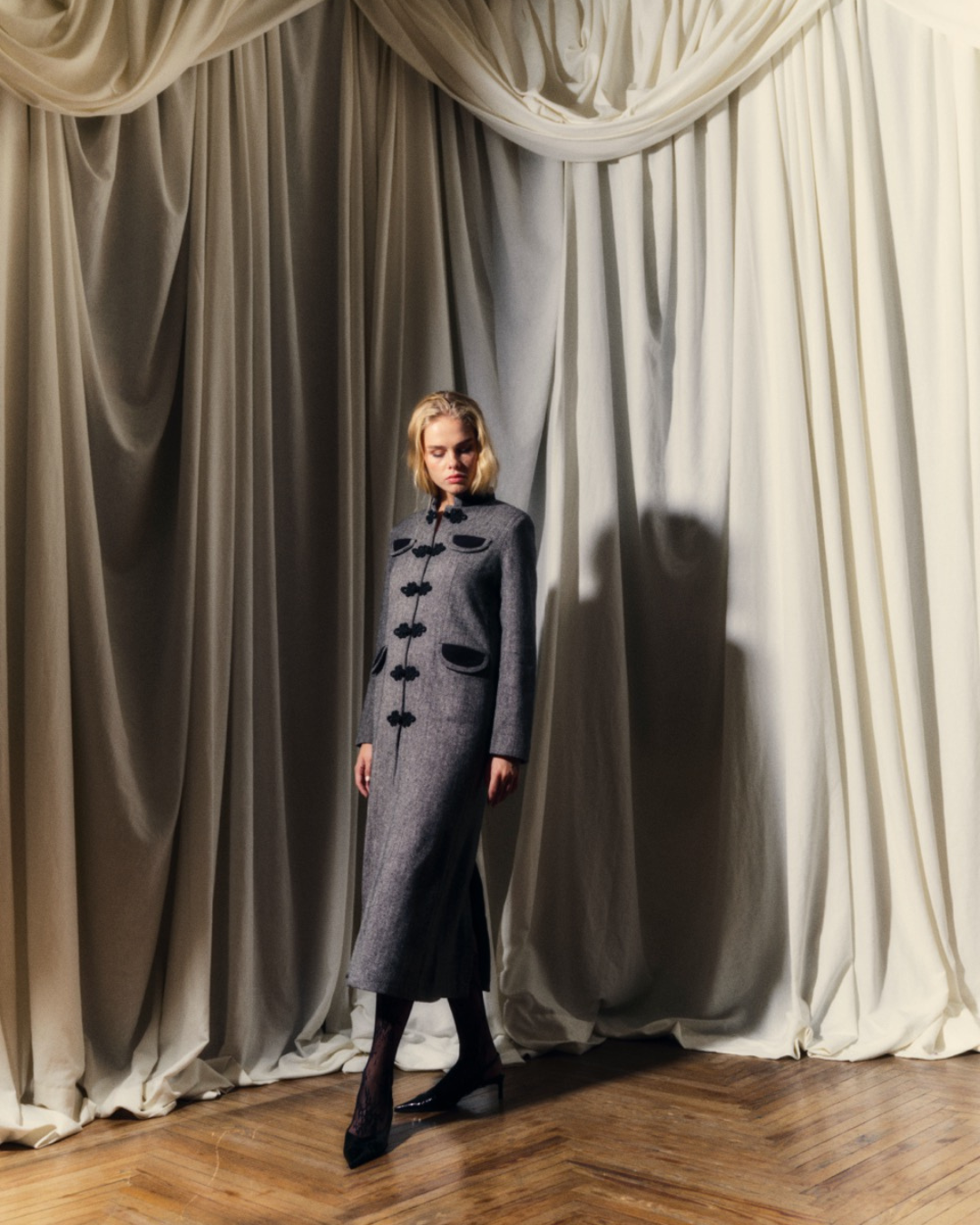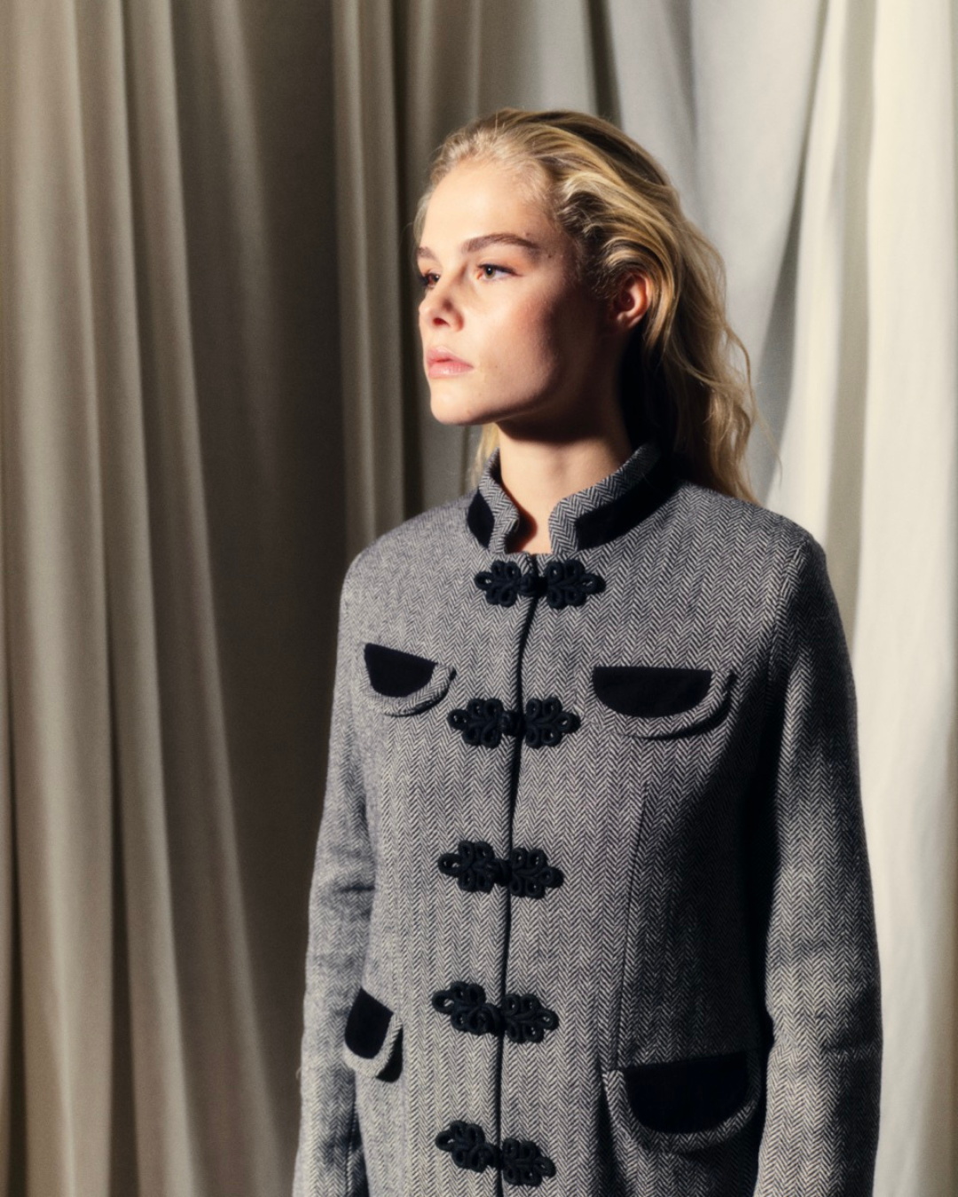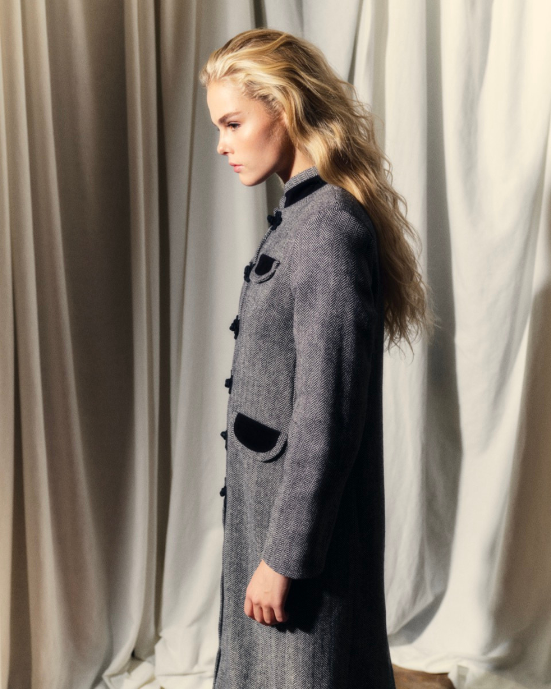 Details that make the difference: This wool coat is set to become the most effortless piece in your wardrobe, with an elegant and, above all, very chic touch. Its design stands out for its exquisite straight cut, designed to be as elegant as possible. The most notable details are the shoulder pads that provide structure, the epaulettes imported from India, the mandarin collar, and the discreet rounded pockets finished in corduroy. But it is above all the black and white herringbone pattern that makes the difference. Once again, 1950s tailoring serves as inspiration for the design of this coat, which stands out even more thanks to the combination of corduroy on the collar and pockets.