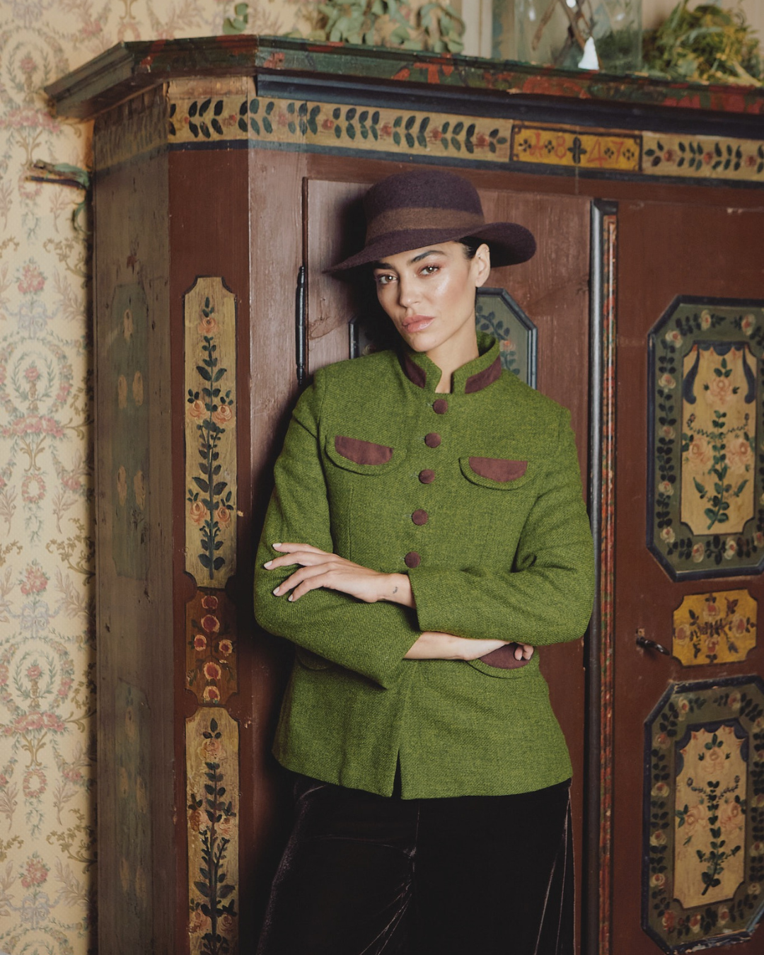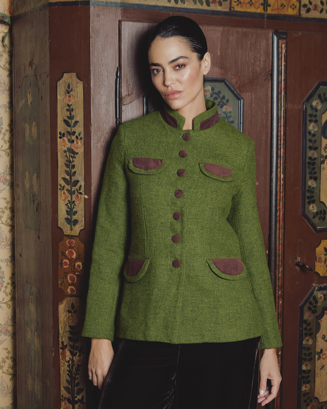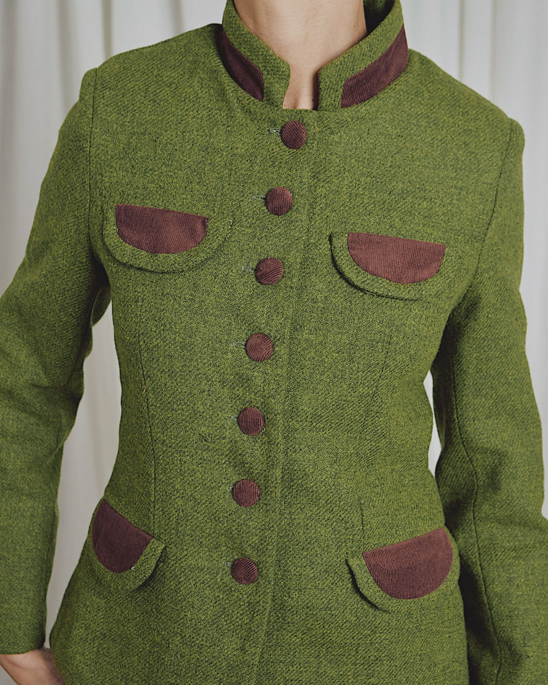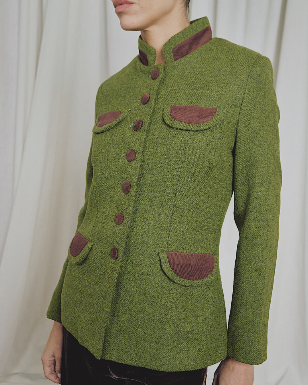Details that make the difference: This khaki green wool jacket is set to become a staple in your wardrobe, but with a fresh and, above all, very chic touch. Its design stands out for its exquisite straight cut, designed to be as elegant as possible. The most notable details are the shoulder pads that provide structure, the epaulettes imported from India, the mandarin collar, and the discreet rounded pockets. All these details are finished in chocolate brown corduroy. Once again, 1950s tailoring serves as inspiration for the design of this blazer, which stands out even more thanks to the combination of black velvet on the cuffs, collar, and pockets.