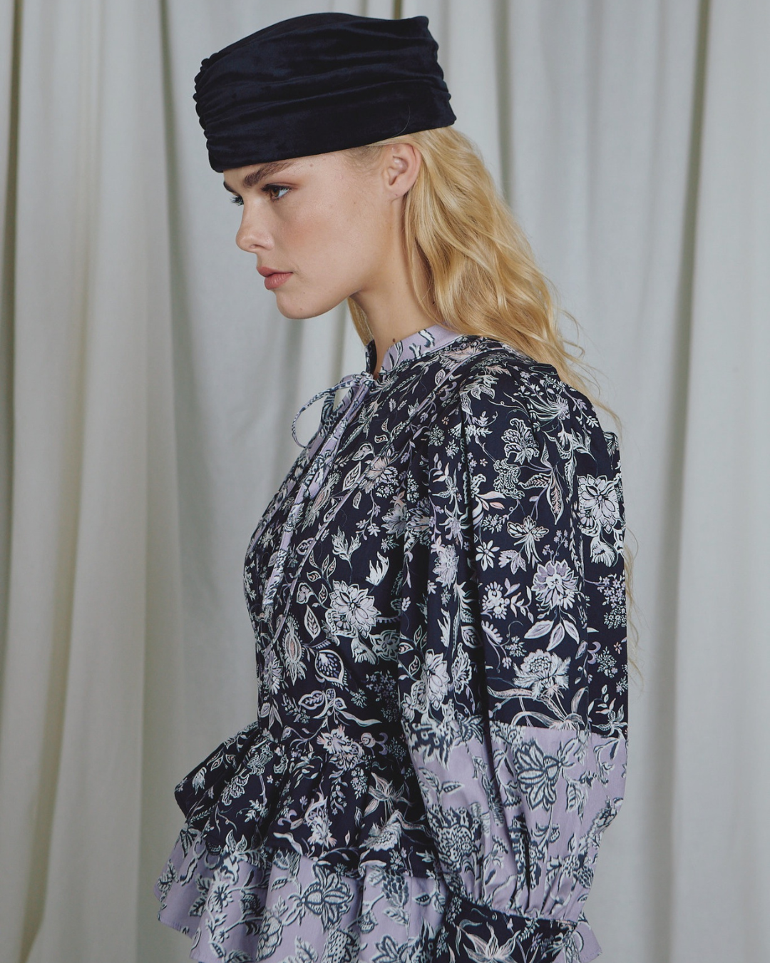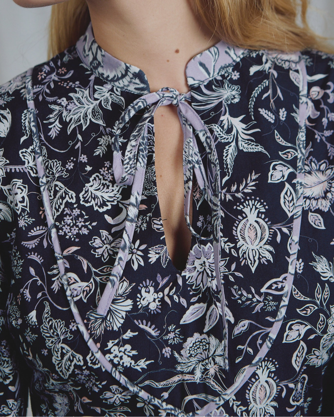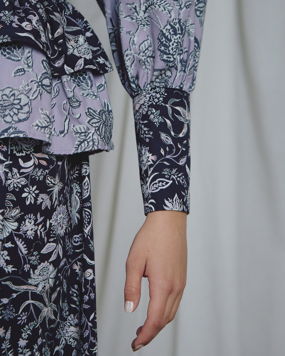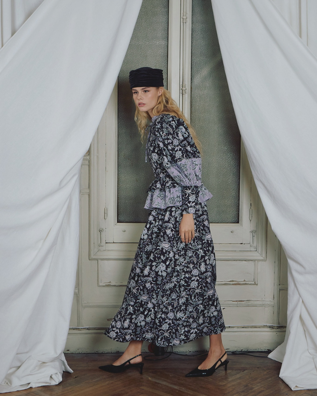 Details that make the difference: The Hamton Surrey Purple dress features a fluid silhouette thanks to its flowing skirt, balanced by puffed sleeves and a fitted bodice that enhances the figure while keeping a natural look. The ruffles at the waist add movement, while the front opening lends an effortless touch. Like all our designs, it’s full of thoughtful details — in this case, contrasting covered buttons and the combination of two fabrics that give it an artisanal feel. This mix of prints can be seen in the ruffles, the sleeves, the mandarin collar, and the bias trim along the placket. The fabric, designed exclusively by the Laganini team, is a delicate Indian-style floral print available in two color variations. This combination of lilac, white, and black feels both romantic and warm.