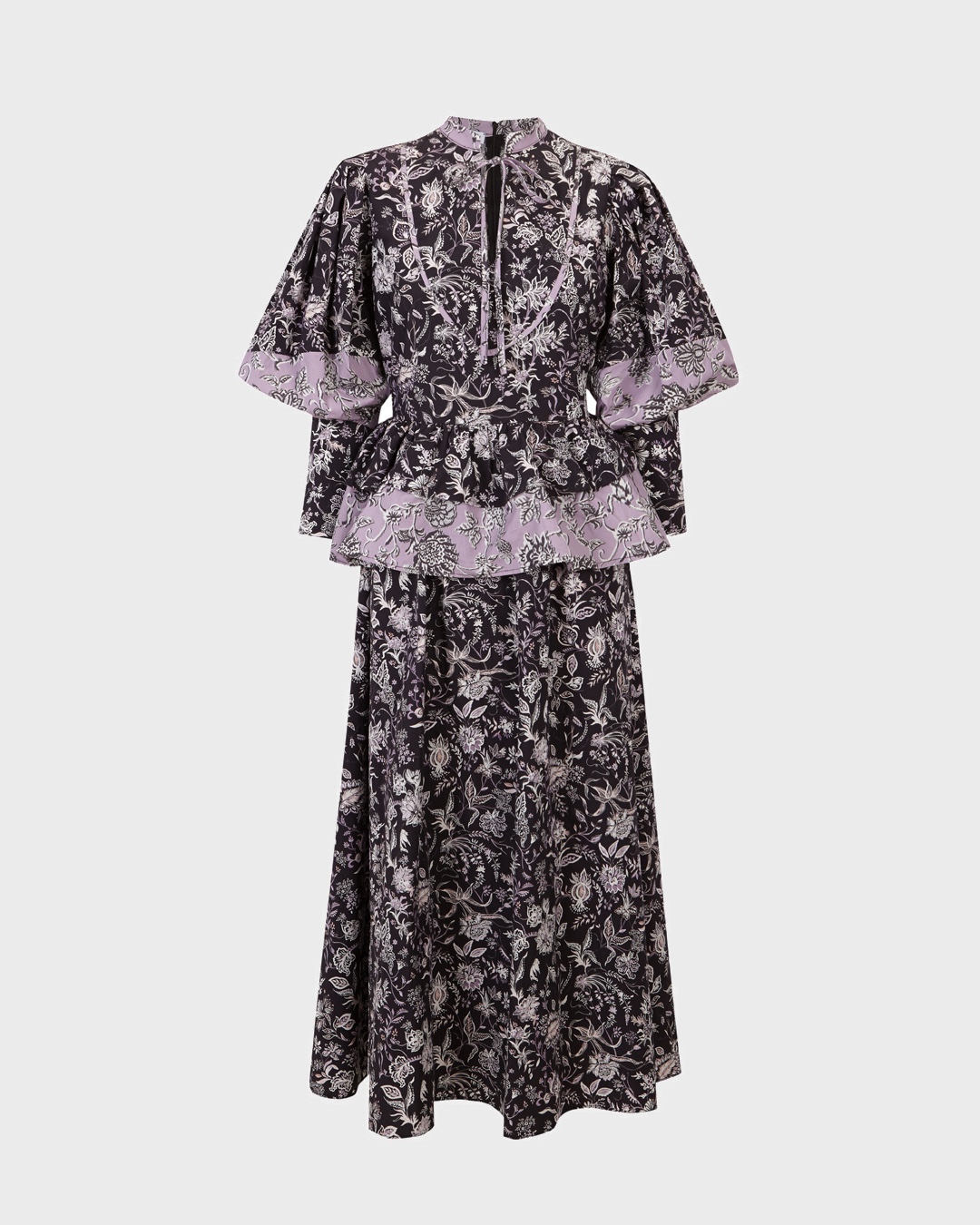 Details that make the difference: The Hamton Lille dress has a flowing silhouette thanks to its skirt, balanced by puffed sleeves and a fitted bodice that enhances the figure without losing its naturalness. The ruffles at the waist add movement and the opening at the chest adds naturalness. As with every garment we design, there are many details, and in this case, the contrasting covered buttons and the combination of two fabrics give it a handmade feel. This combination of prints can be seen on the ruffles, sleeves, mandarin collar, and bias binding on the bodice. This fabric is designed by the Laganini team and features a delicate Indian floral print in two color variations. This combination of lilac, white, and black is both romantic and warm.