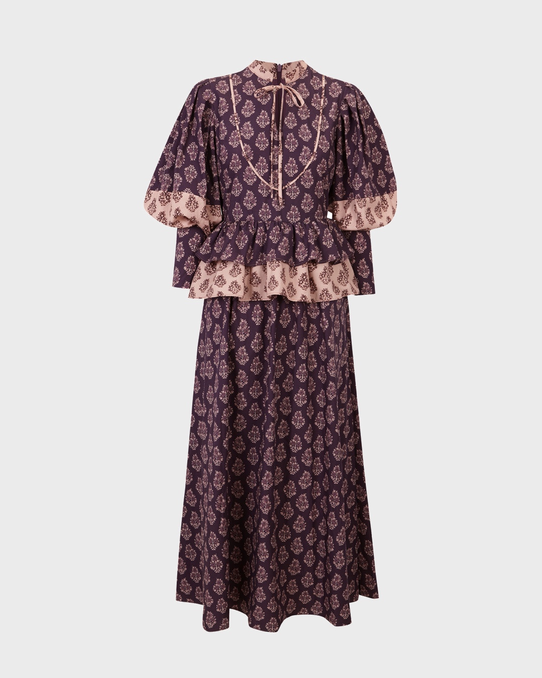 Details that make the difference: The Hamton Surrey Purple dress features a fluid silhouette thanks to its flowing skirt, balanced by puffed sleeves and a fitted bodice that enhances the figure while maintaining a sense of ease. The ruffles at the waist add movement, while the front opening brings a touch of natural charm. Like all our designs, it’s full of thoughtful details — in this case, contrasting covered buttons and the combination of two fabrics that lend it an artisanal feel. This mix of prints can be seen in the ruffles, the sleeves, the mandarin collar, and the bias trim along the placket. The fabric, designed exclusively by the Laganini team, is a delicate floral print inspired by traditional Indian block prints, available in two color variations. This combination of purple and peachy orange feels both romantic and warm.