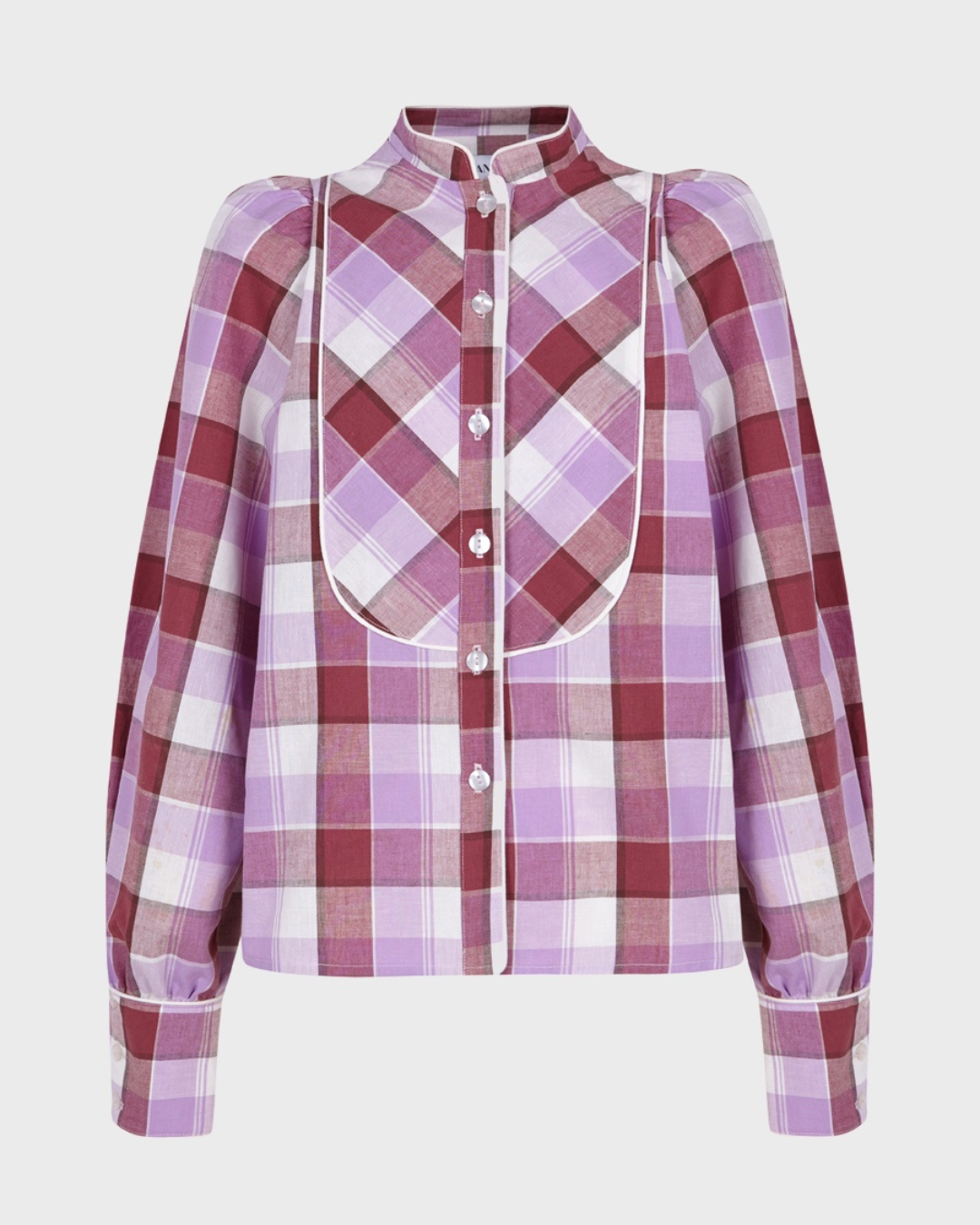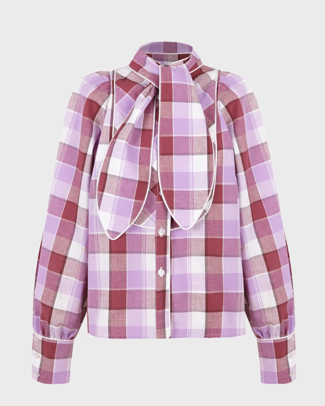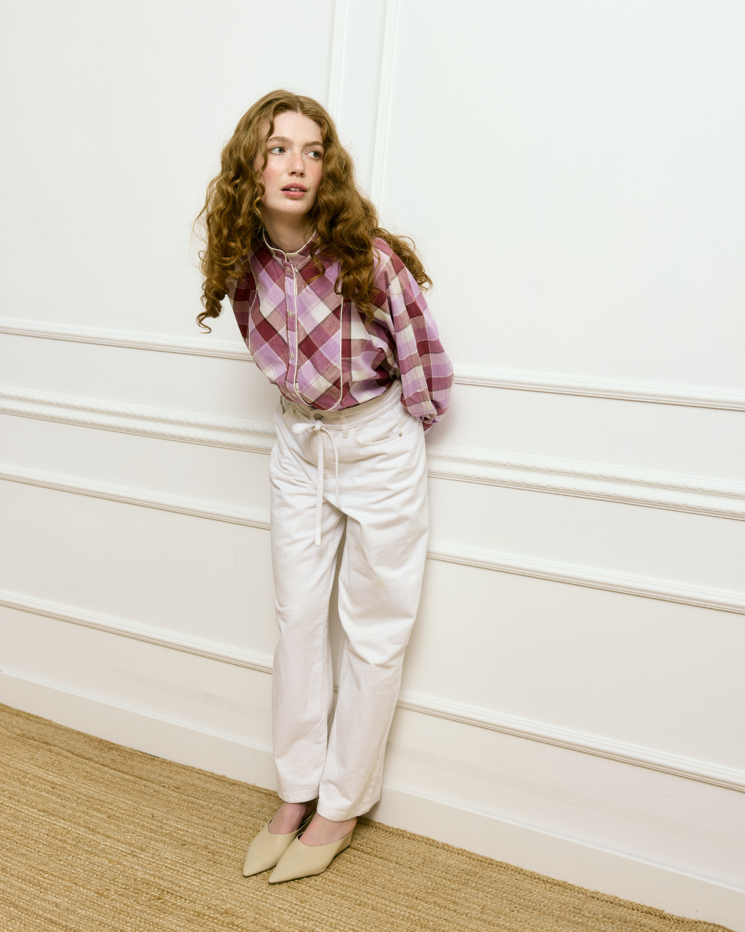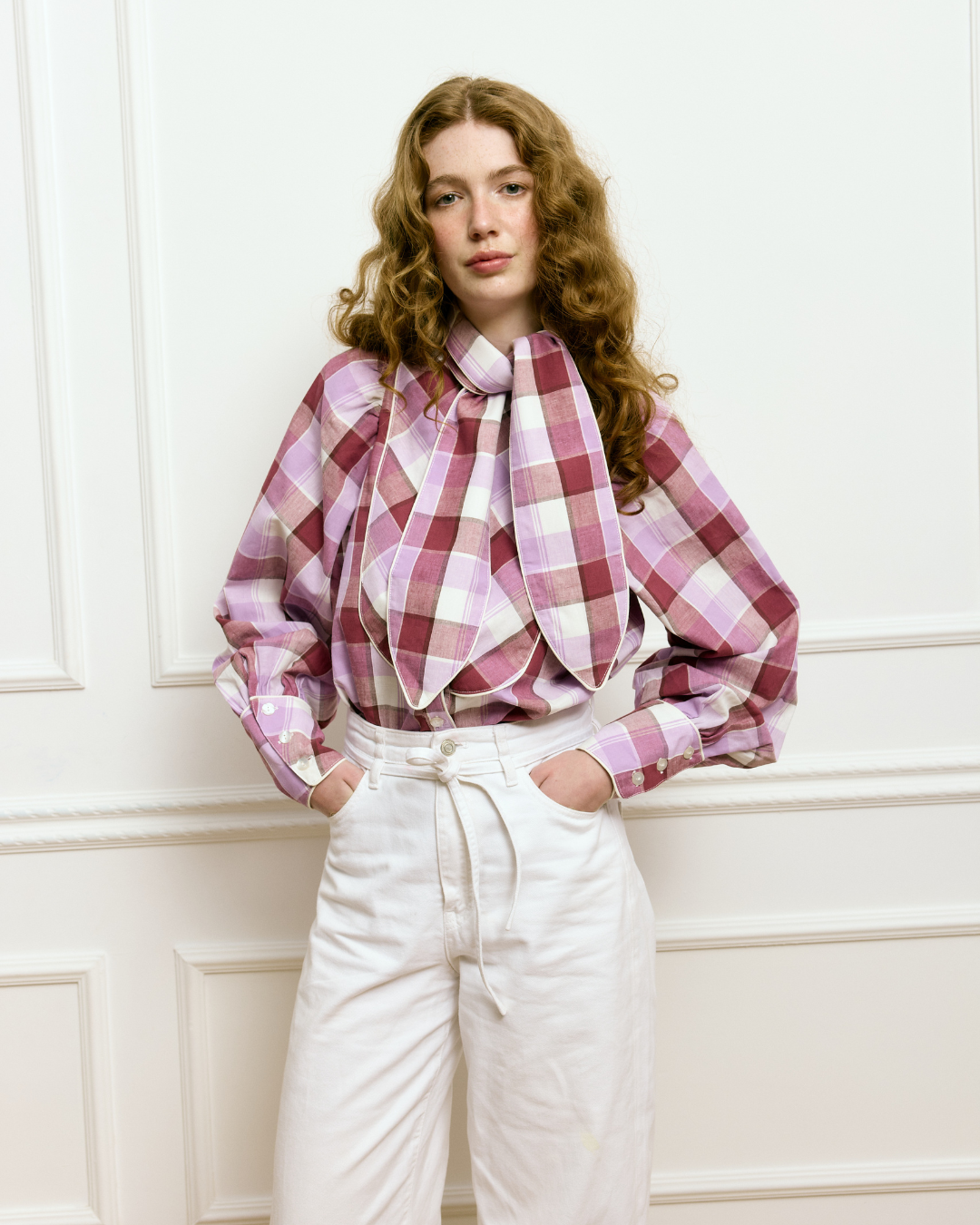 Details that Make the Difference: We invite you to discover the details of its construction. The white piping, the yoke, the puffed sleeves, and its special tie. These elements make this garment a guarantee of originality, elegance, and style. However, what stands out most is the special plaid fabric in maroon, pink, and white tones, which will leave no one indifferent.