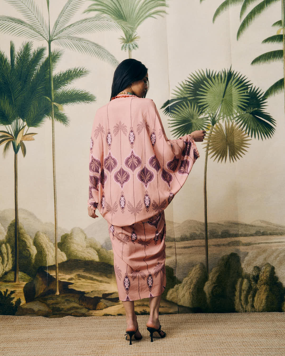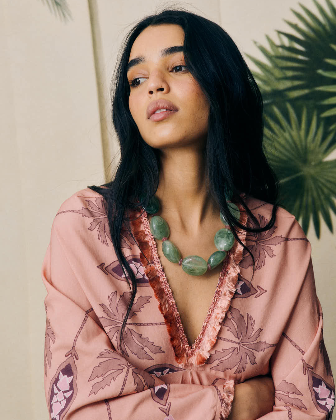 Details that make all the difference: Its botanical-inspired print, featuring leaves and organic shapes in maroon and pink tones on a terracotta background, makes this garment a visually unique piece. The symmetrical motifs and geometric details lend a sophisticated and artistic air that reflects the creative spirit of the collection. With a V-neck, 3/4 sleeves, and a loose fit, it flatters all body types. Perfect for a special summer day, a getaway by the sea, or a relaxed afternoon in the city, this kaftan is a versatile piece that won’t go unnoticed. Its loose design and carefully crafted print make it easy to adapt to different styles and occasions.