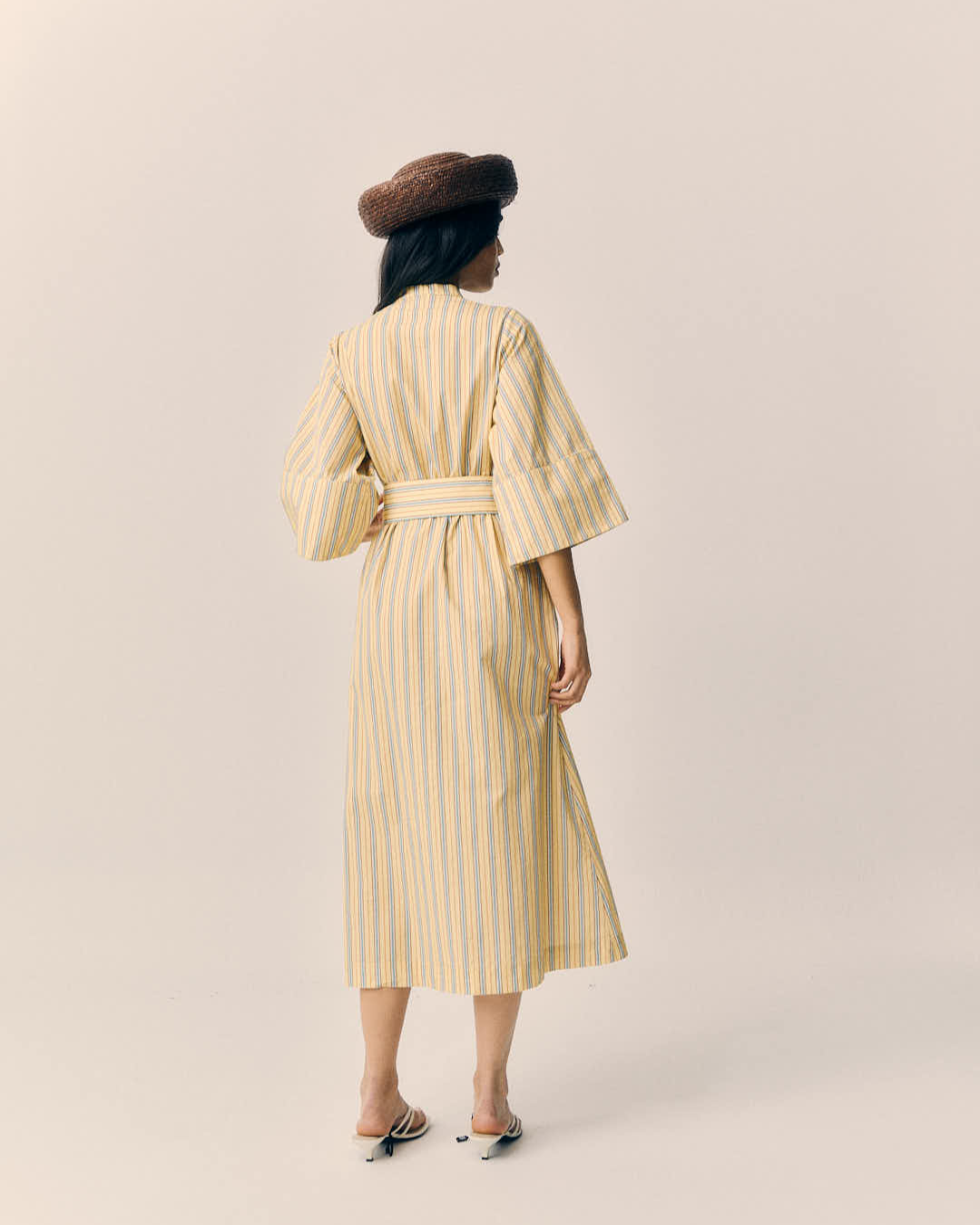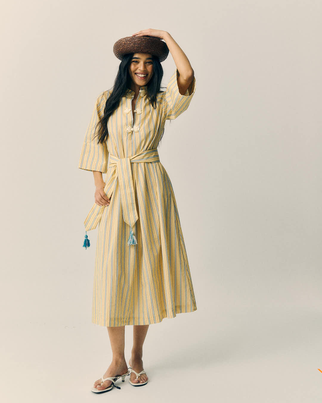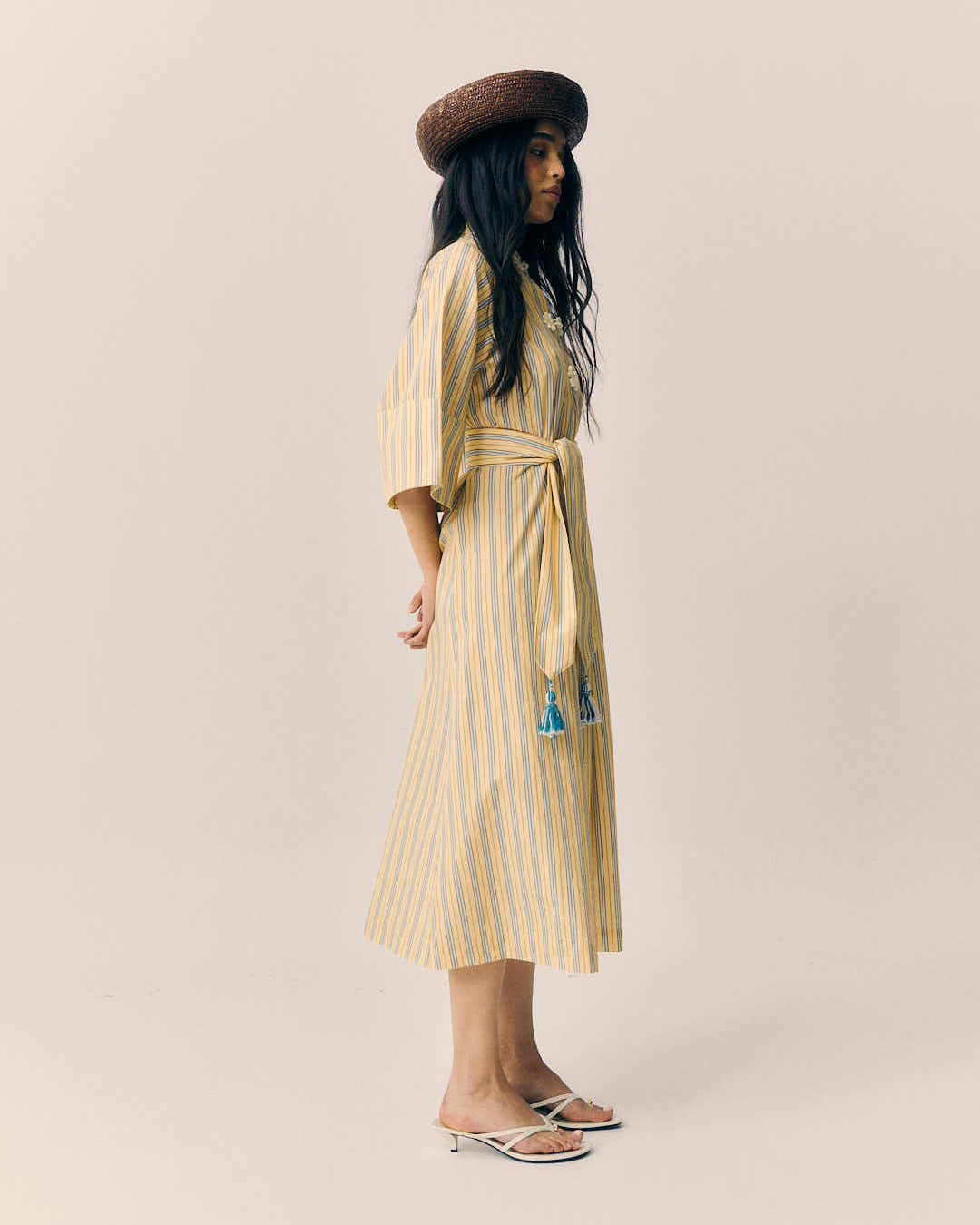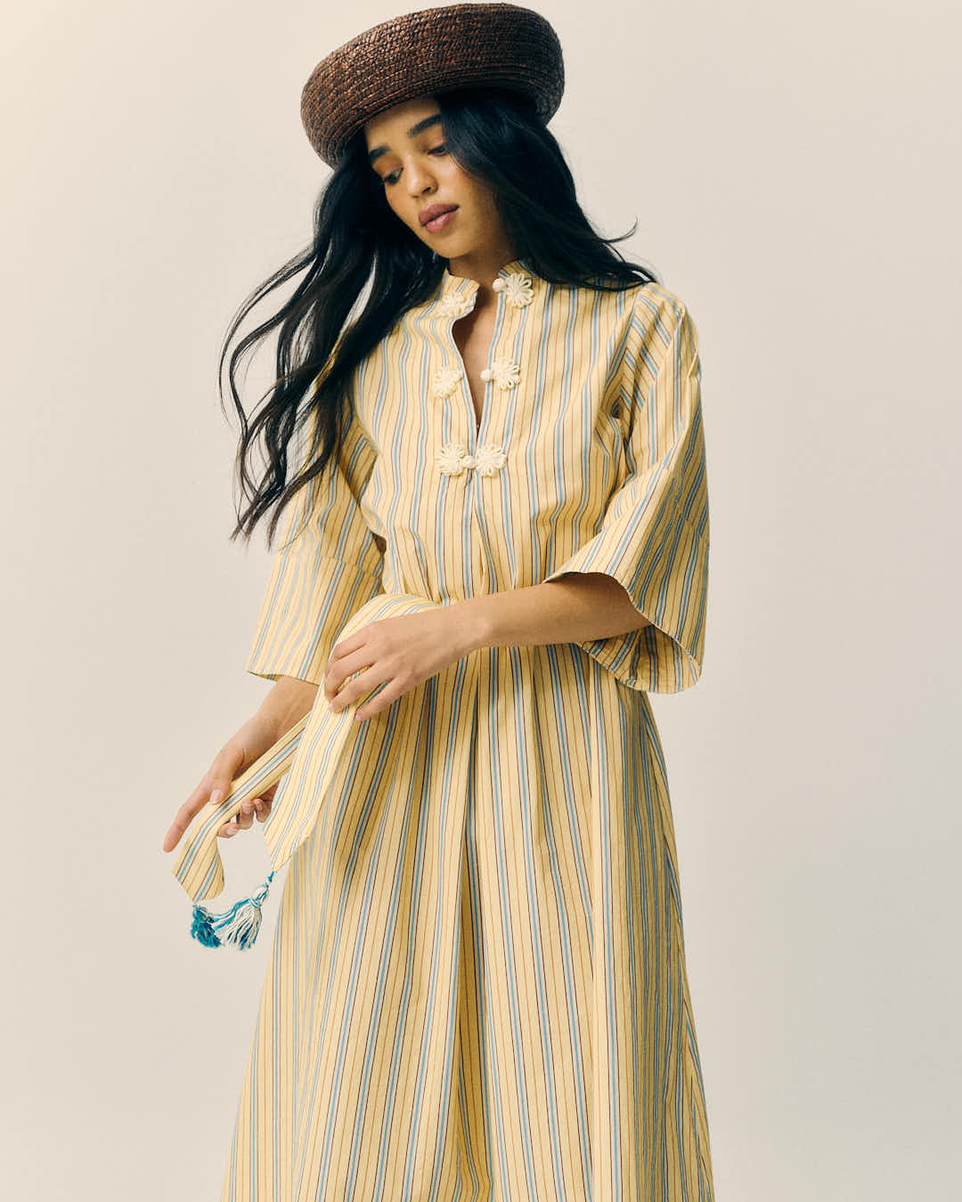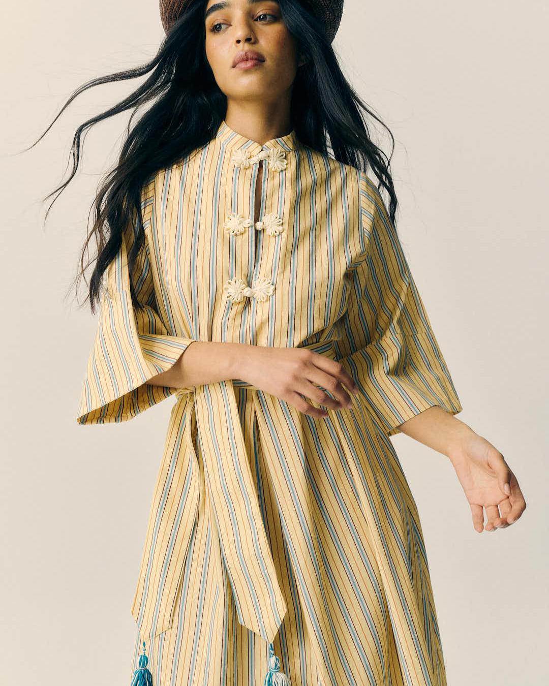 Details that Make the Difference: Its straight but slightly flared cut fits all types of morphologies, while its long and loose fit makes it the most comfortable dress of the season. It features ¾ flared sleeves, a mao collar finished with our signature buttons and a front center front placket that adds a unique touch to the dress. Finally, it is its belt with tassels in blue color, which allows you to totally change the dress and make it tight to the waist and highlight your figure. Its yellow and blue striped print is designed by us and stands out for its contrasting colors.