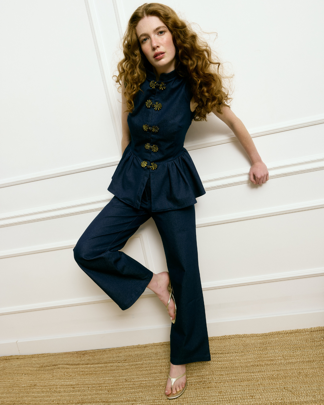 Details that Make the Difference: With wide legs, a fitted waist, the finest cotton fabric, and details such as ric-rac trim that make them truly special. They work perfectly as a set or as a standalone piece. As part of the denim set, they have become one of the most elegant pieces of the season—and it’s easy to understand why—but above all they have become an emblem of the brand.