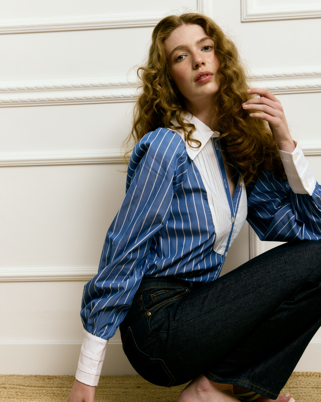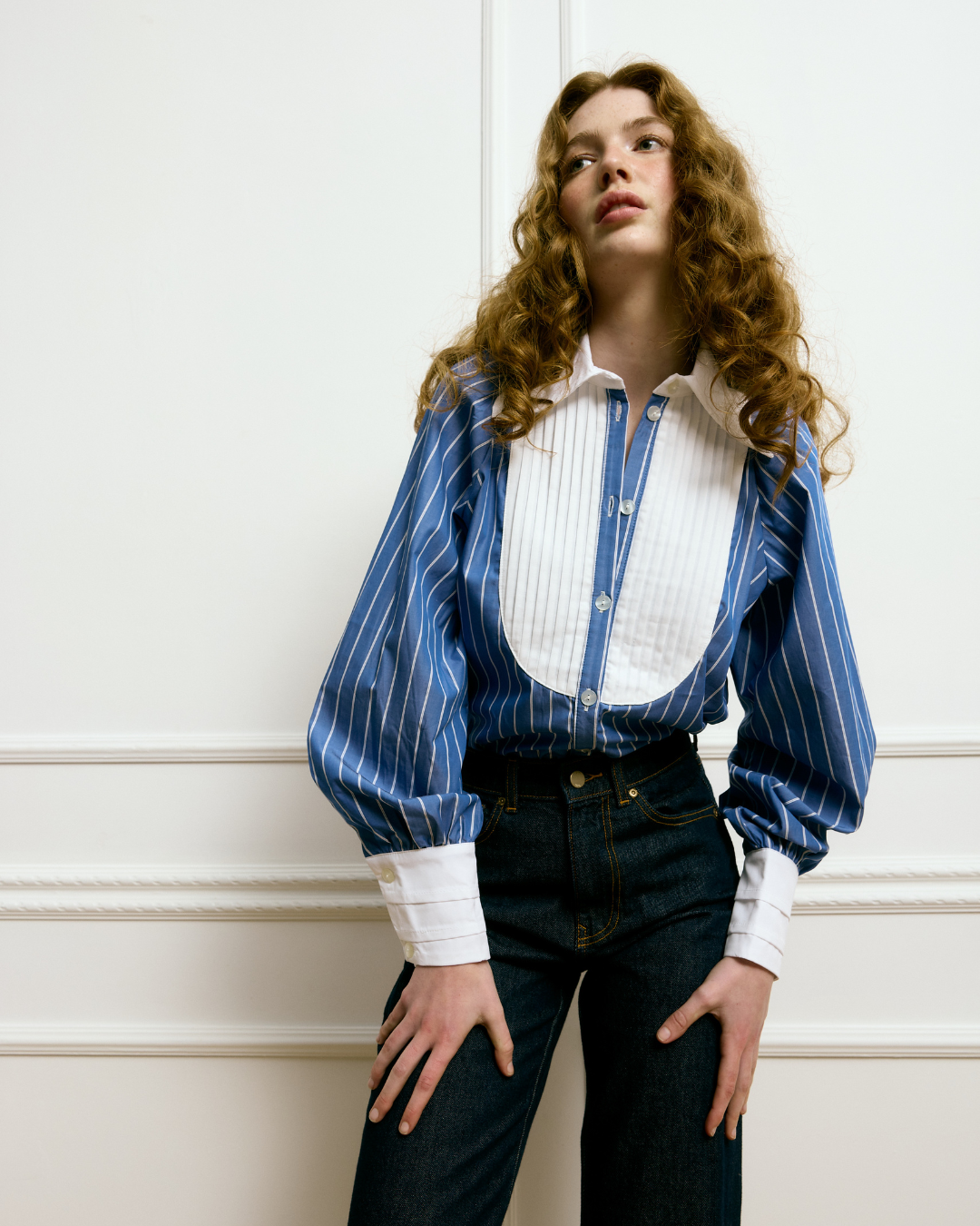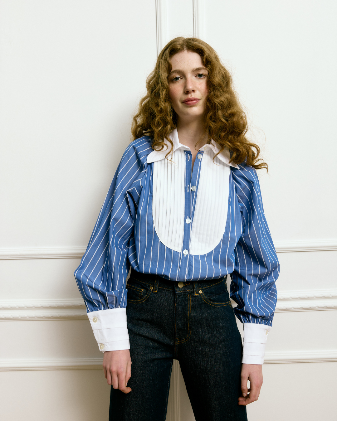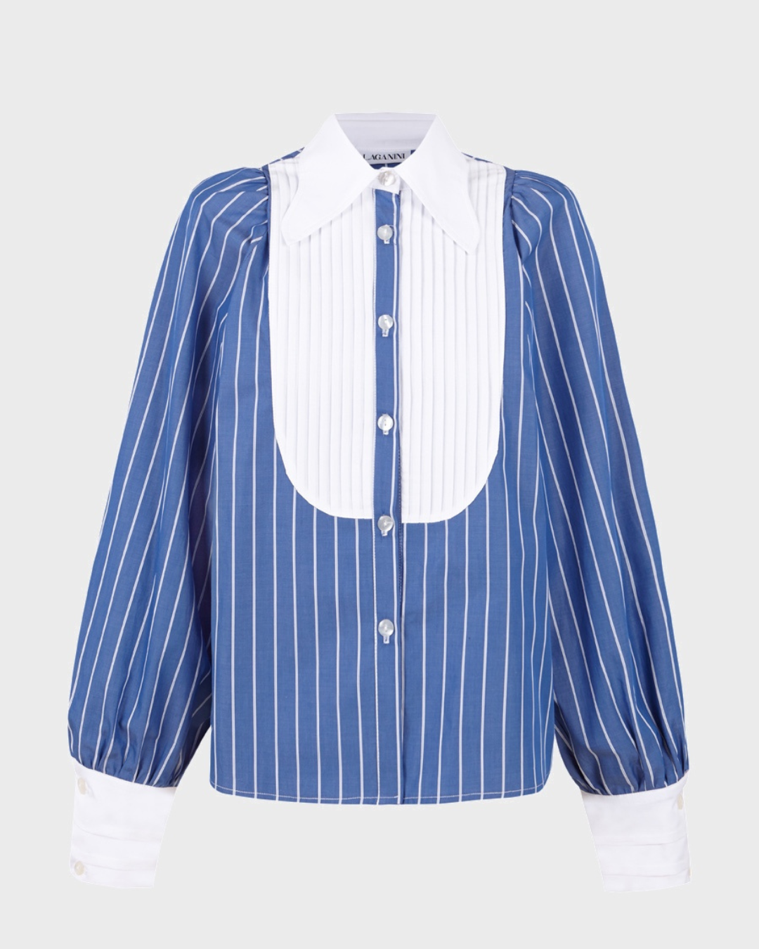 Details that make the difference: We invite you to discover the details of its construction: the more formal and refined V-neck, the yoke, the puffed sleeves that offer dramatic volume reminiscent of 19th-century fashion, and the cuffs with tabs. These elements make this garment a guarantee of originality, elegance, and style. But above all, it is the pleated fabric on the chest and its striped pattern in the most elegant blue that undoubtedly make it even more special.