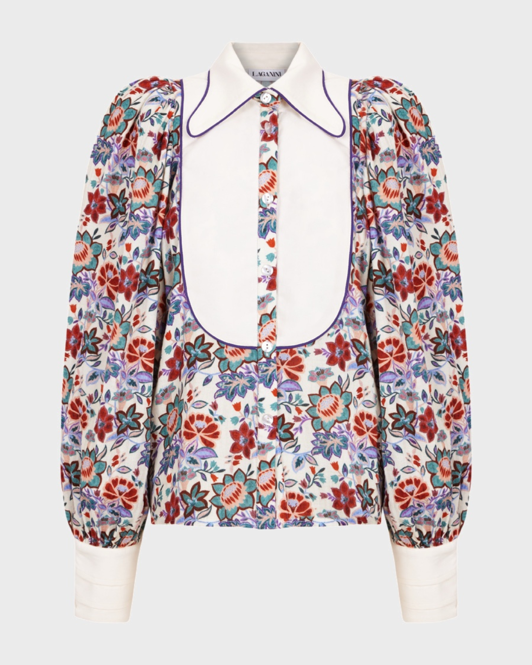 Details that make the difference: We invite you to discover the details of its construction: the more formal and refined V-neck, the yoke, the purple piping, the puffed sleeves that offer dramatic volume reminiscent of 19th-century fashion, and the cuffs with tabs. These elements make this garment a guarantee of originality, elegance, and style. But above all, it is the Indian-style floral print and contrasting front panel that undoubtedly make it even more special.