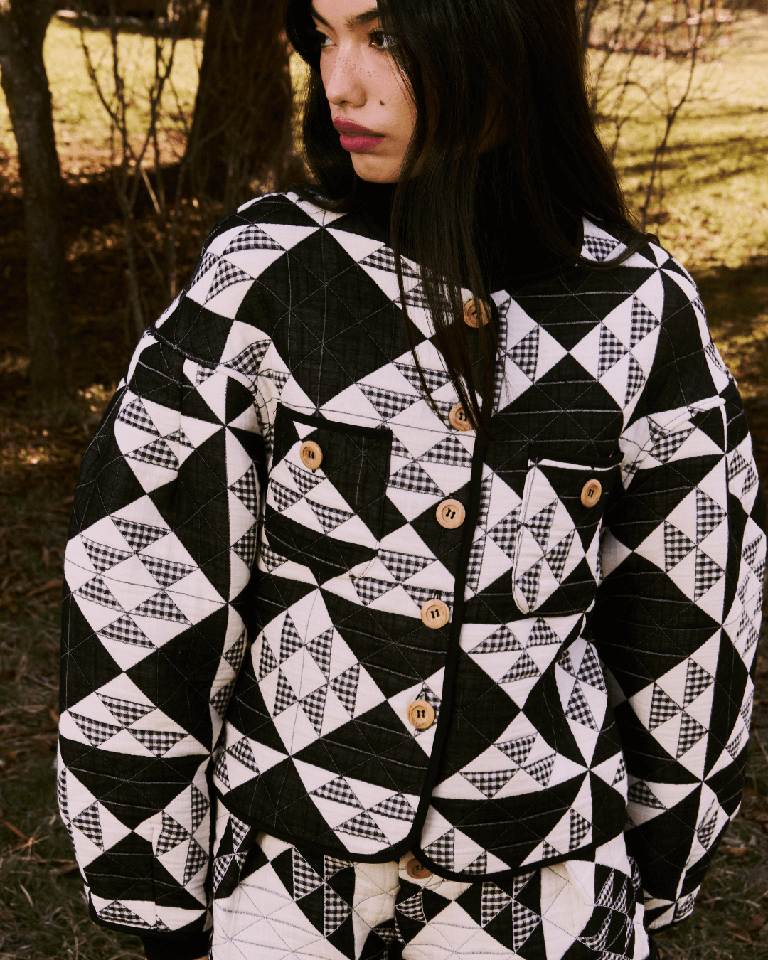 Detalles que Marcan la Diferencia: Nuestra chaqueta Canela quilt black es esa prenda exclusiva y especial que estabas buscando ya que está acolchada. Con un corte recto que sienta bien a todos los tipos de cuerpos, la chaqueta Canela se caracteriza por contar con un cuello redondo que ofrece un acabado limpio y moderno, hombros caídos que evocan un estilo relajado y desenfrenado, abotonadura en la parte delantera para añadir comodidad y bolsillos en el pecho para dar un toque estético. Tanto su estampado geométrico como sus botones de madera añaden un toque artesanal y étnico.