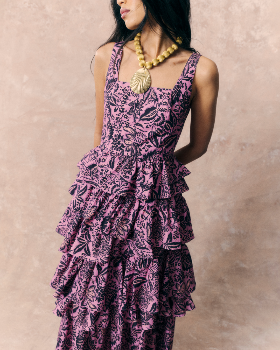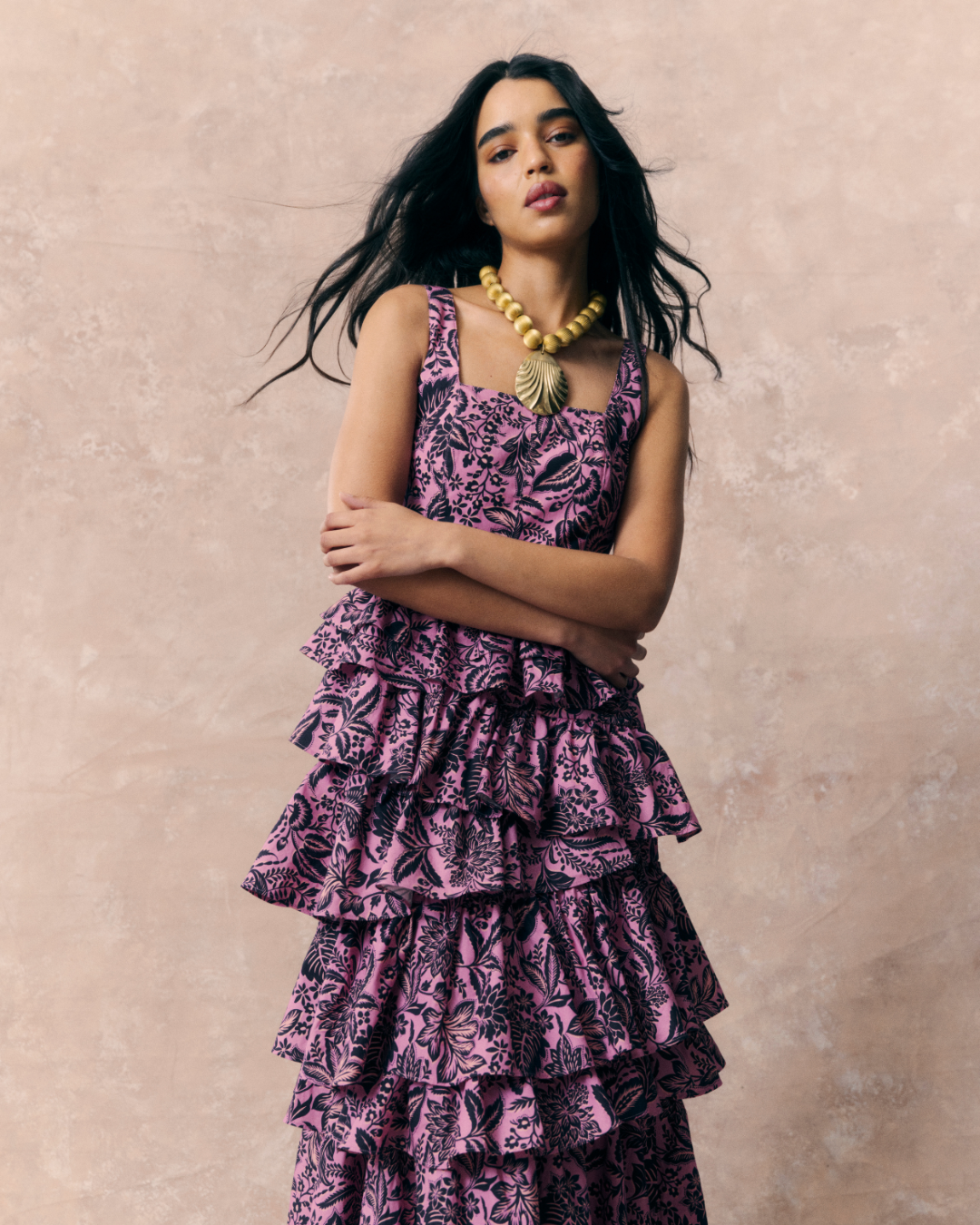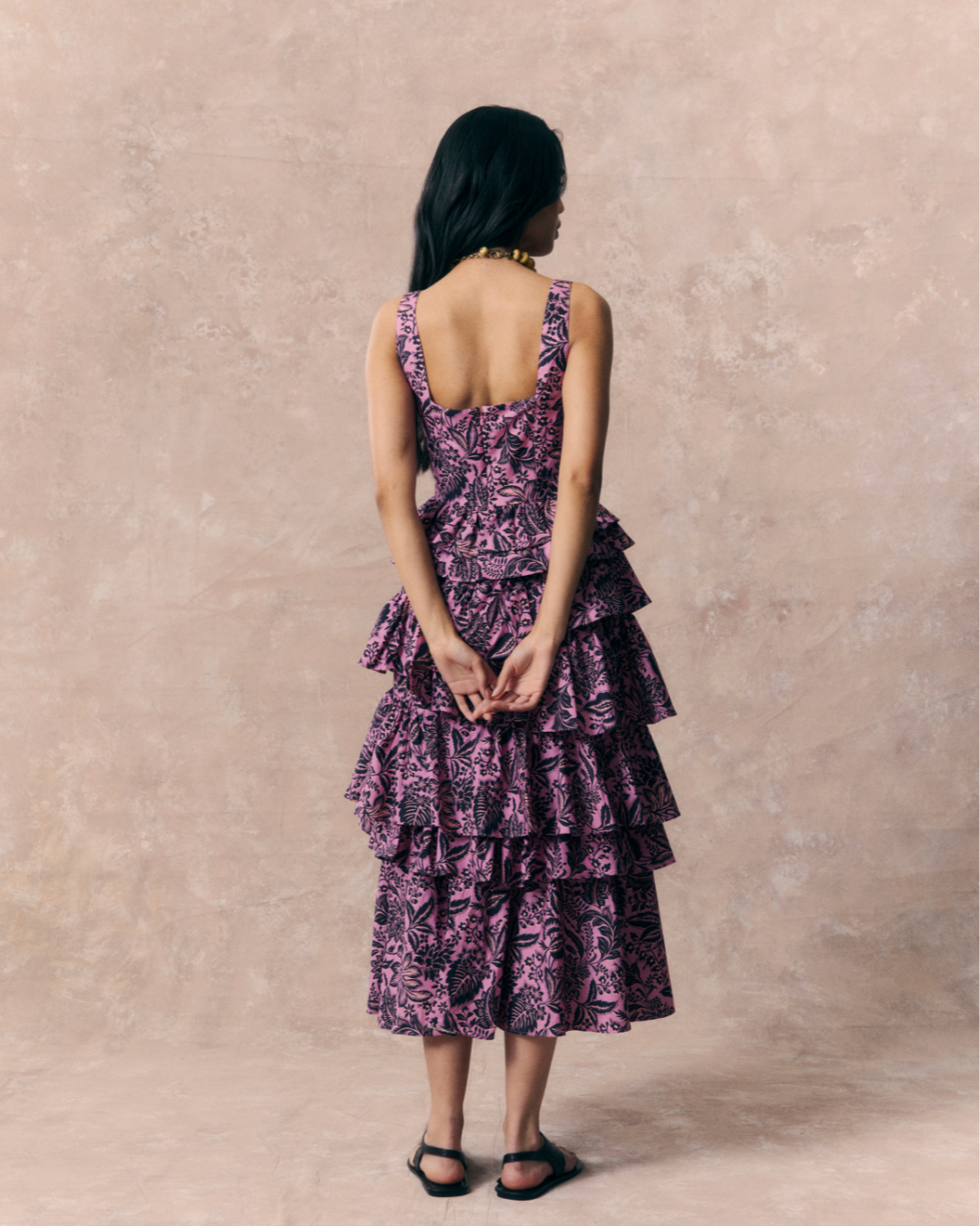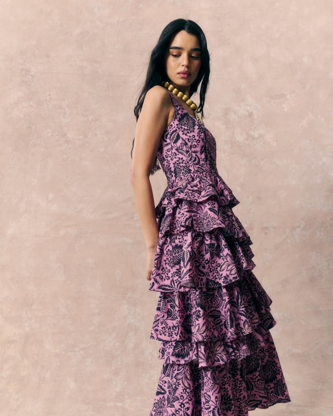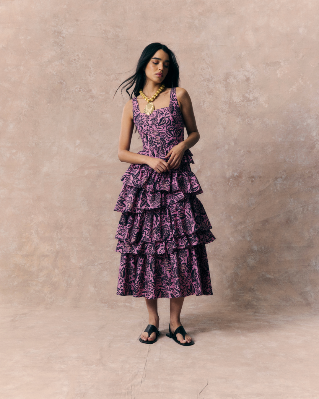 Detalles que Marcan la Diferencia: Su diseño entallado en el torso resalta la silueta mientras que la falda de volantes aporta dinamismo. Sus tirantes anchos aportan un mayor soporte y comodidad , su cuello con forma cuadrada alarga el cuello y realza el escote, y su cuerpo estructurado moldea la silueta y estiliza la cintura. Pero lo que de verdad llama la atención son sus volantes fruncidos e irregulares, que aportan fluidez y ligereza. Su original estampado está diseñado por nosotras mismas, lo que la hace todavía más especial. Se trata de un estampado floral en tonos rosados y negros crea un contraste sofisticado y atemporal, ideal para quienes buscan un look con personalidad. Confeccionado en un algodón de la mejor calidad, ligero y fluido, este vestido garantiza comodidad y frescura en cada uso.