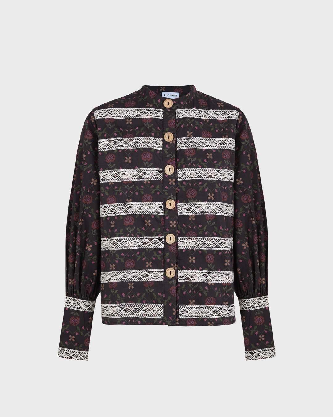 Detalles que marcan la diferencia: La nueva camisa Billie Banofee se caracteriza por tener una silueta recta que sienta bien a todo tipo de cuerpos, un cuello mao, tan característico de la marca y mangas abullonadas en los puños. Pero sobre todo destaca por un estampado romántico diseñado que simula un ser un bordado de cenefas florales en tonos pasteles sobre una base negra. Además, toda la camisa está decorada con una cinta de bolillo bordada que destaca por su artesanía y botones de madera que aumentan ese toque romántico. El conjunto de todas estas características forma una camisa que atraerá todas las miradas.