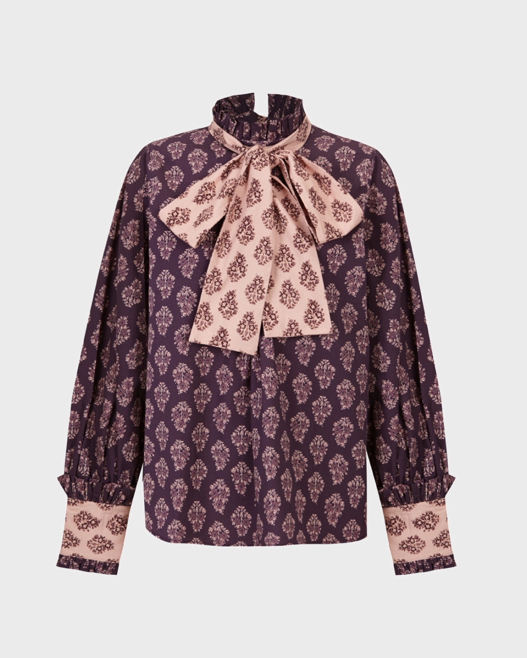 Detalles que Marcan la Diferencia: La nueva camisa Poppy Surrey Purple se caracteriza por tener el patrón que mejor sienta en todos los cuerpos y por su exquisito estampado combinado. Este tejido se caracteriza por ser clásico y versátil pero también porque se puede usar para cualquier ocasión. La mezcla del color berenjena con el color melocotón y el estampado de cenefas florales la convierten en una blusa super especial. Está diseñado por el equipo Laganini y da a la blusa un aire romántico y femenino. Detalles como el cuello plisado, maxi lazo anudado al cuello, parte del pecho plisada, mangas abullonadas y los exquisitos volantes en los puños, son lo que hacen de esta camisa la más especial de la temporada.