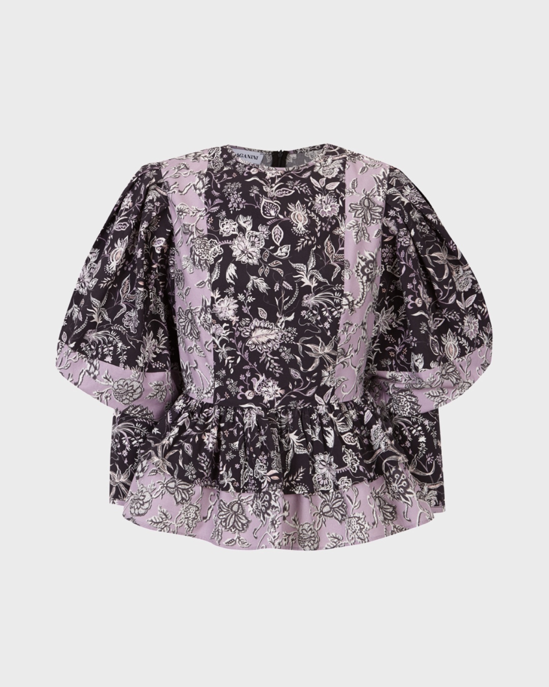 Detalles que marcan la direfencia: La nueva blusa Sea Lille llama la atención por la cantidad de detalles que tiene y por su impresionante tejido diseñado por el equipo de Laganini. Se trata de una blusa de corte recto, ligeramente ceñida a la cintura, de la cual parten dos volantes que disimulan las curvas y una manga abullonada tanto en hombro como en puño. Su cuello redondo y el bajo de los puños están terminados por un biés a contraste que marca la diferencia, y consta de dos cortes que van de hombro a cintura, pasando por pecho, y que consigue que su patrón favorezca a cada tipo de cuerpo. Una de las grandes distinciones es la combinación de tejidos, la cual aporta ligereza y movimiento. Ambos tejidos comparten paleta de color, y se trata de una indiana en tonos lila y negro con detalles en gris y blanco.