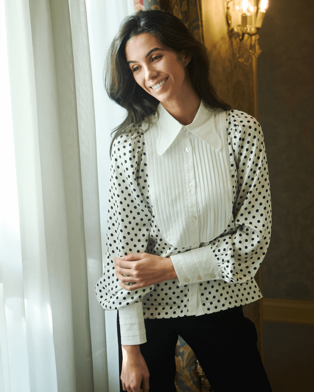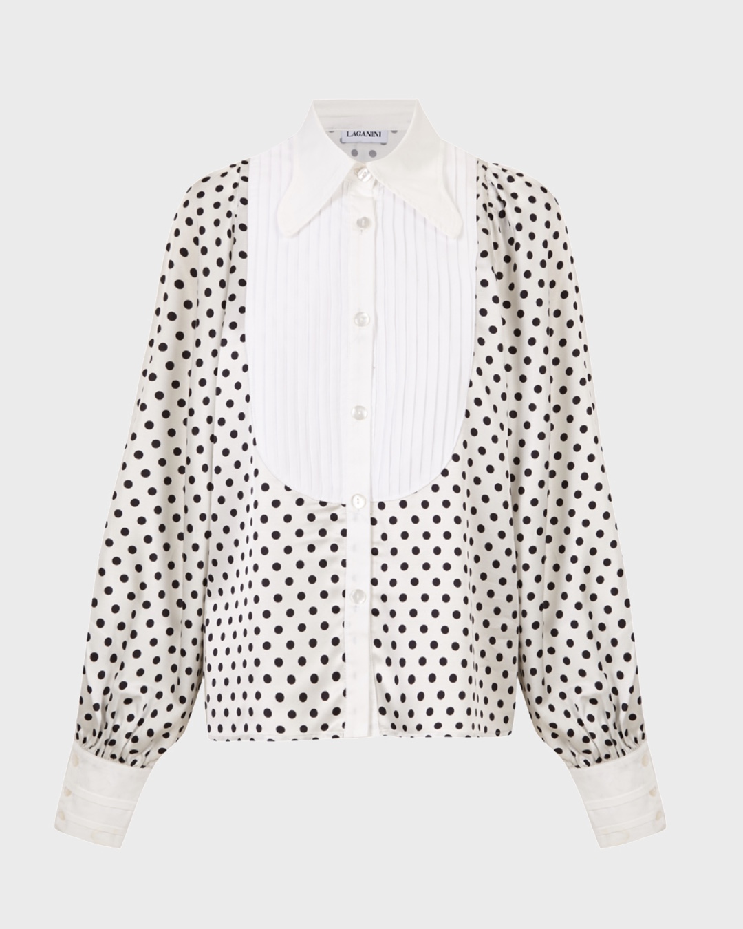 Detalles que Marcan la Diferencia: Te invitamos a que descubras los detalles de su confección: el cuello en pico más formal y refinado, el canesú, las mangas abullonadas que ofrecen un volumen dramático que evoca la moda del siglo XIX y los puños con tablillas. Estos elementos hacen de esta prenda una garantía de originalidad, elegancia y estilo. Pero sobre todo es el pecho terminado con un tejido plisado y su estampado de topos, tan a la última, lo que la hacen sin duda aún más especial.