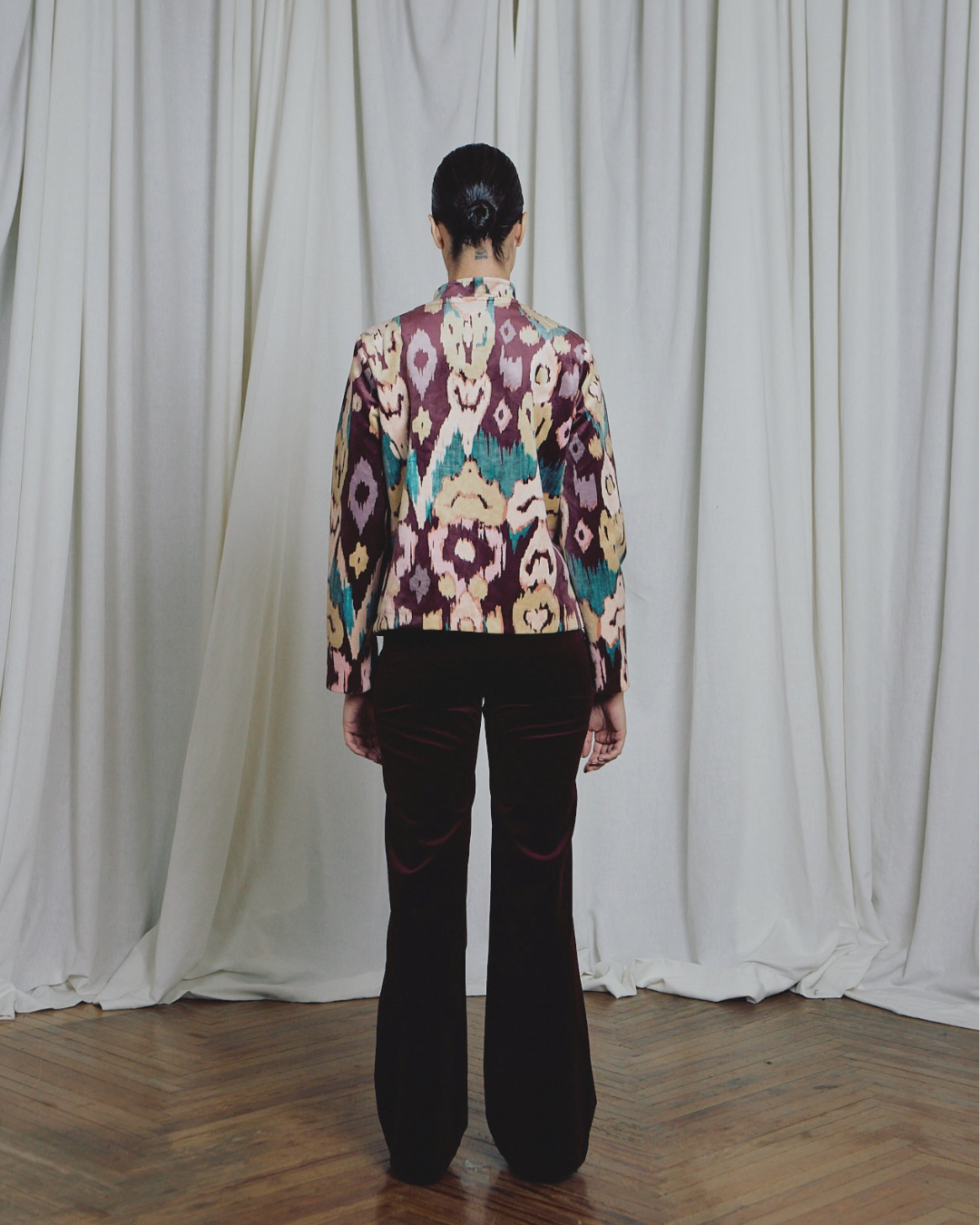 Detalles que Marcan la Diferencia: La chaqueta Tang se caracteriza por tener corte recto, cuello mandarín, bolsillos con tapeta y los mejores botones de pasamanería en tono burgundy. En su tejido de terciopelo se puede ver un estampado ikat en tono berenjena, mostaza y rosa palo. El ikat viene pisando fuerte esta temporada y si además lo mezclas con una chaqueta que no puede sentar mejor, se convierte en el diseño más elegante y original de la colección.