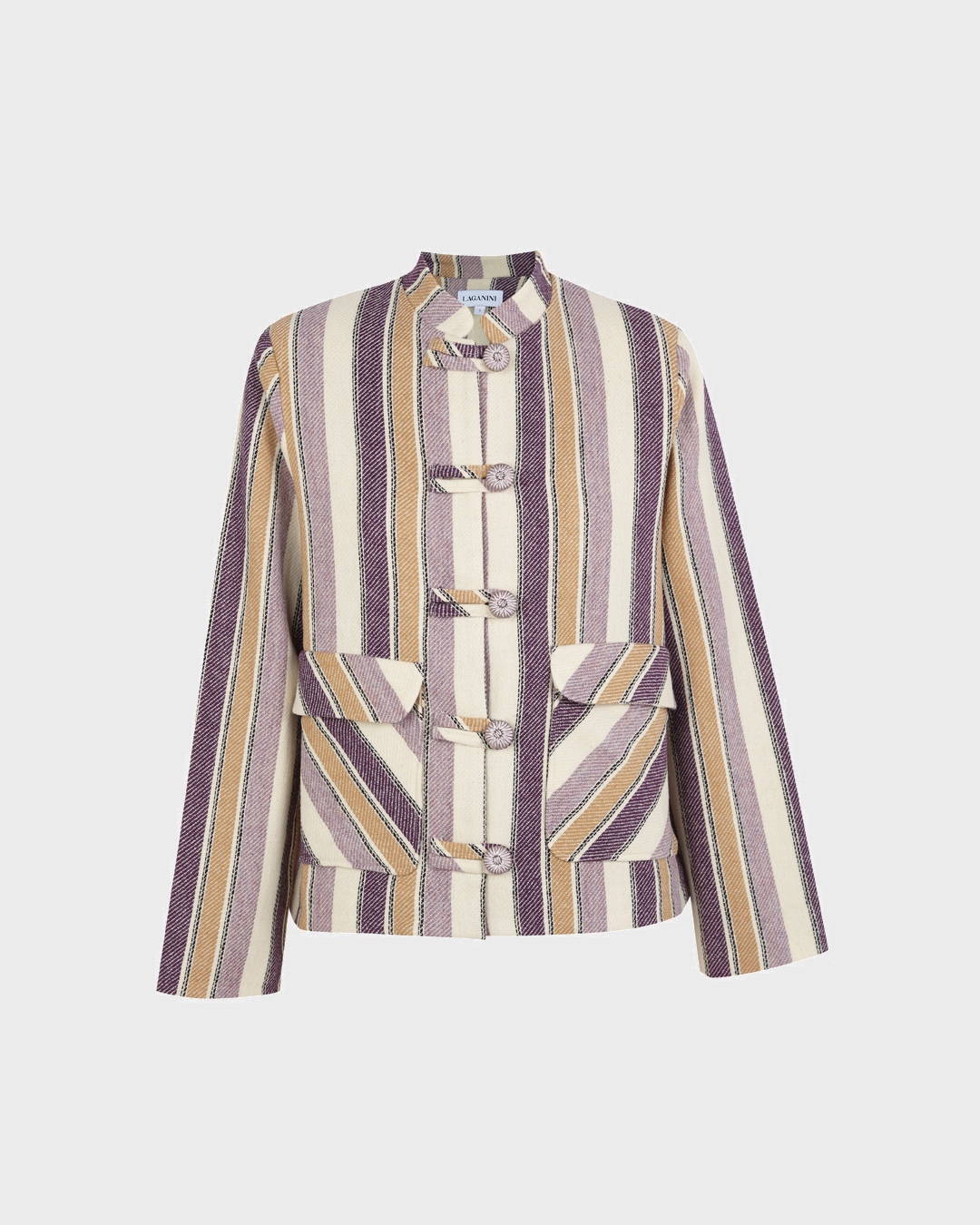 Detalles que Marcan la Diferencia: La chaqueta Tang se caracteriza por tener corte recto, cuello mandarín, bolsillos con tapeta, los mejores botones de pasamanería en tono lila. Su tejido, una mezcla de lana con cashmere, es de la mejor calidad, y llama la atención por sus originales rayas que mezclan mostaza, beige, lila y morado. Las rayas viene pisando fuerte esta temporada y si además lo mezclas con una chaqueta que no puede sentar mejor, se convierte en el diseño más elegante y divertido de la colección.