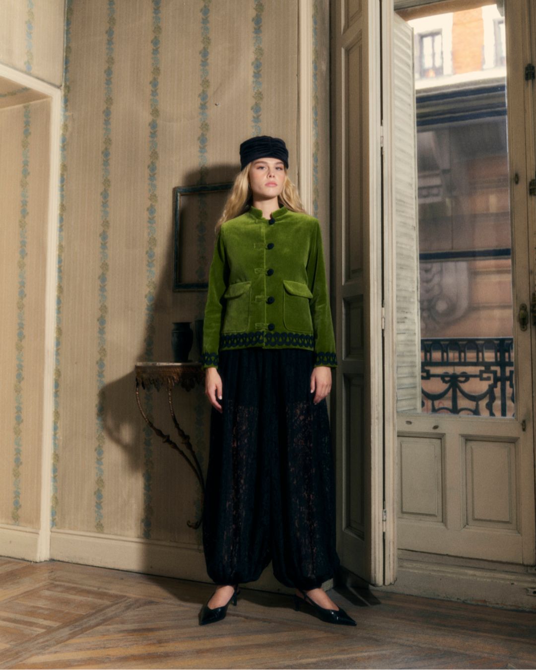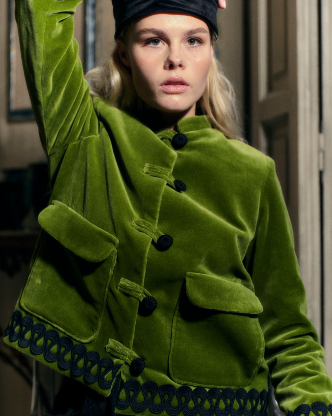 Detalles que Marcan la Diferencia: La chaqueta Tang se caracteriza por tener corte recto, cuello mandarín, bolsillos con tapeta, los mejores botones de pasamanería y una ondulina que le da un toque más sofisticado a la chaqueta. Su tejido de terciopelo tiene el verde más bonito nunca visto. El verde pistacho viene pisando fuerte esta temporada y si además lo mezclas con una chaqueta que no puede sentar mejor, se convierte en el diseño más elegante y atemporal de la colección.