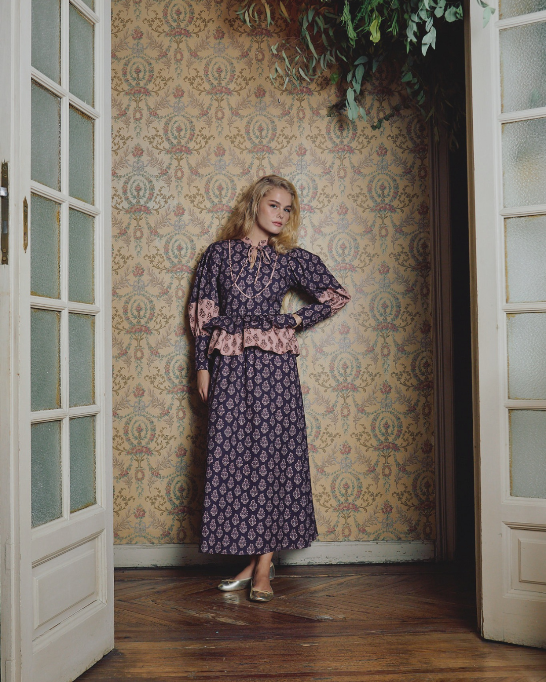 Detalles que marcan la diferencia: El vestido Hamton Surrey Purple tiene una silueta fluida gracias a su falda y se equilibra con las mangas abullonadas y el cuerpo entallado que realza la figura sin perder naturalidad. Los volantes en la cintura aportan movimiento y la apertura en la pechera naturalidad. Como cada una de las prendas que diseñamos cuenta con multitud de detalles y en este caso los botones forrados a contraste y la combinación de dos tejidos aportan un aire artesanal. Esta combinación de estampados se puede apreciar tanto en los olantes como en las mangas, el cuello mao y el bies en la pechera. Este tejido esta diseñado por el equipo de Laganini y se trata de un delicado estampado floral de inspiración block print india que está en dos variaciones de colores. Esta combinación de morado y naranja melocotón es a la vez romántica y cálida.
