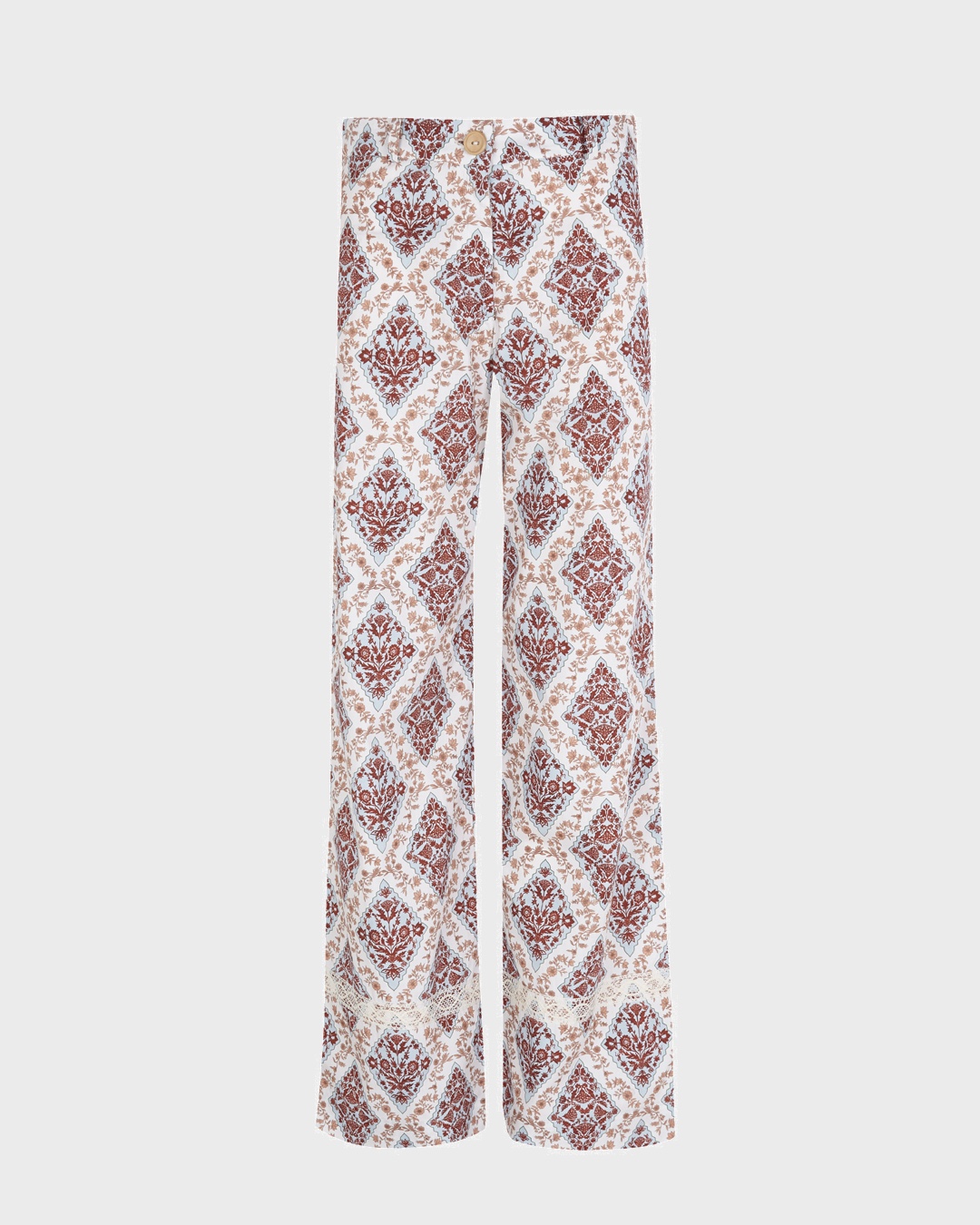 Detalles que marcan la diferencia: Con pernera ancha, cintura entallada, el mejor tejido de algodón, y detalles como la ondulina, que lo hacen súper especial. Funciona a la perfección como conjunto o por separado. Como parte del conjunto Crumble se ha convertido en uno de los más elegantes de la temporada y no es difícil entender por qué, pero sobre todo se ha convertido en el emblema de la marca. Para cualquier ocasión y para el evento más esperado del año, el pantalón Punky Crumble no pasará desapercibido por lo bien que sienta y por su bonito tejido. Este estampado tan romántico que simula un bordado, destaca por las cenefas florales en granate, mostaza y azul sobre una base beige. Además, en el bajo del pantalón podrás encontrar una cinta de bolillo bordada que destaca por su artesanía.