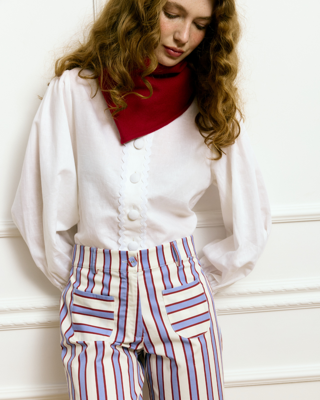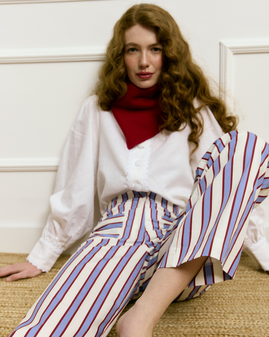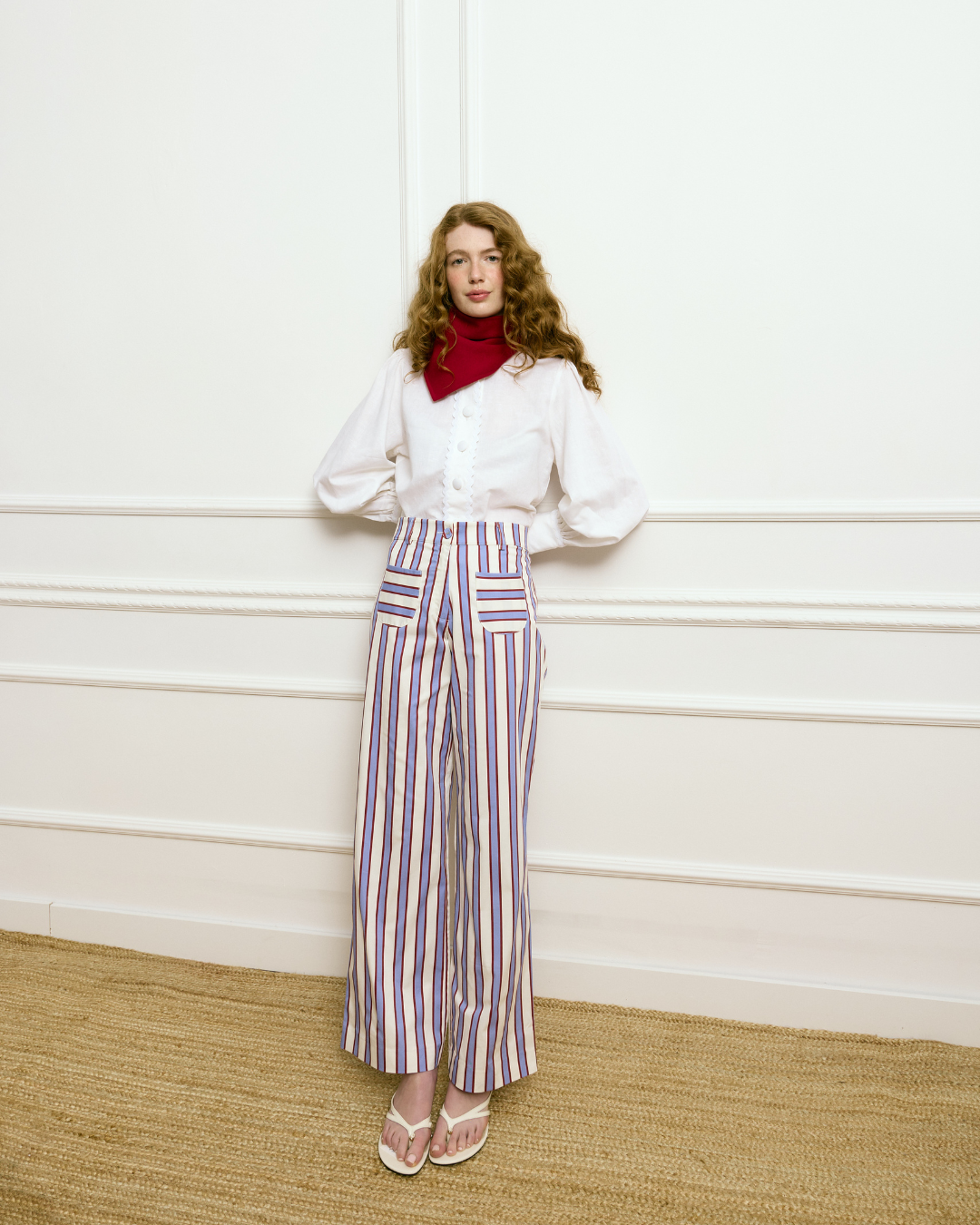 Detalles que Marcan la Diferencia: Con pernera ancha, cintura entallada, el mejor tejido de algodón, y detalles que lo hacen súper especial. Sabemos que os encantan las rayas y en esta ocasión la combinación de azul, granate y blanco no puede hacer mejor match.