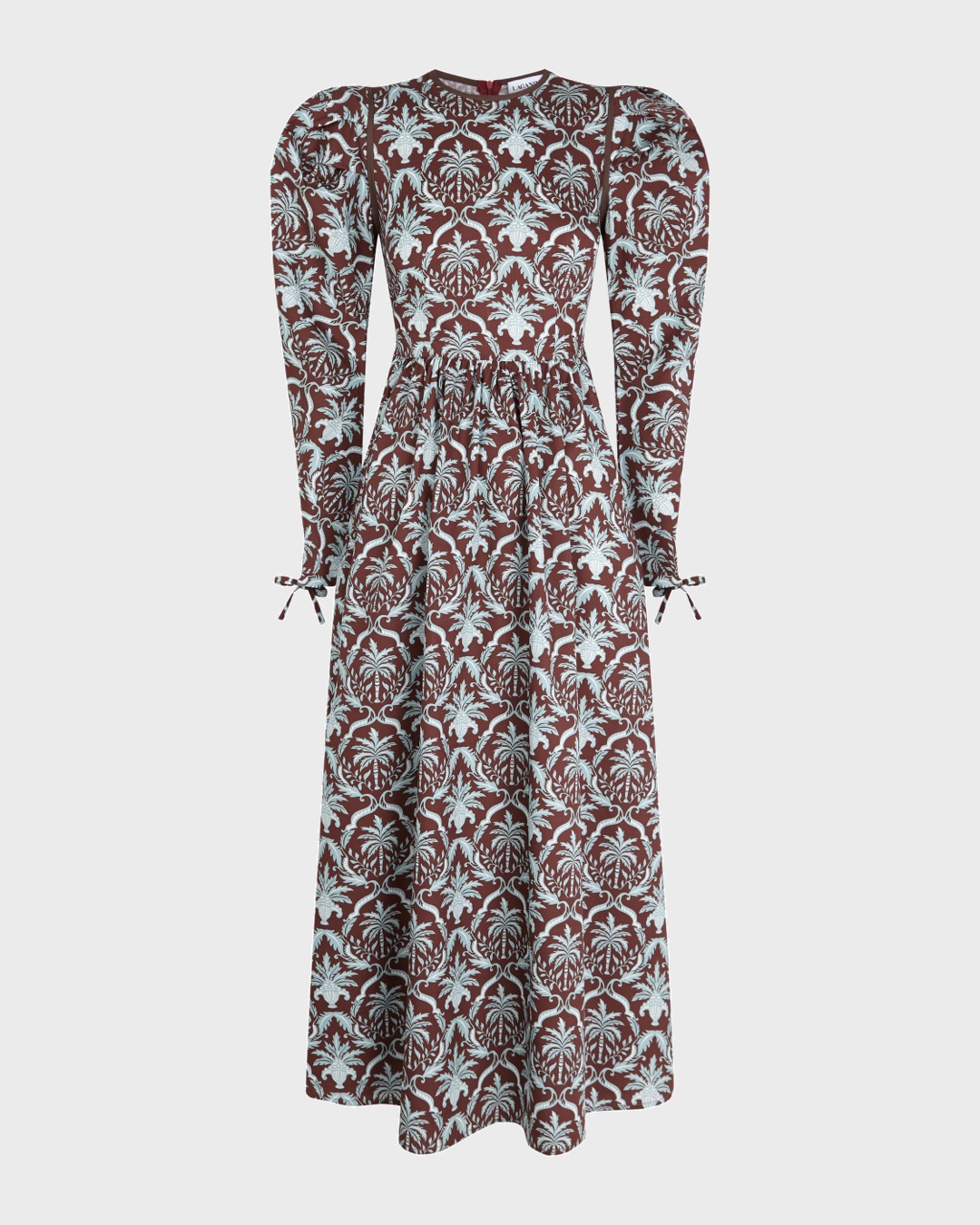 Detalles que marcan la diferencia: El vestido Peach Wallpaper Brown se caracteriza por un falda con vuelo de largo midi, un cuerpo ligeramente ceñido al pecho y cintura que realza la figura, unas mangas abullonadas tanto en hombros como en puños y unos puños cerrados mediante botones forrados cosidos a mano. Pero sin ninguna duda es el biés a tono en cuello, sisa y puños lo que da un toche chic al vestido. Su tejido en tonos azules sobre base marrón, es un estampado vegetal de aire damasco con motivos vegetales, que combina romanticismo con un toque exótico. Este vestido sirve tanto para el día a día como para el evento más esperado del año.