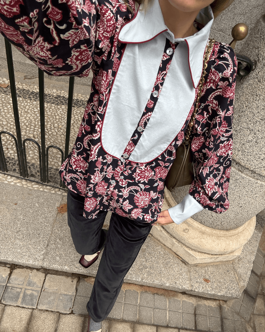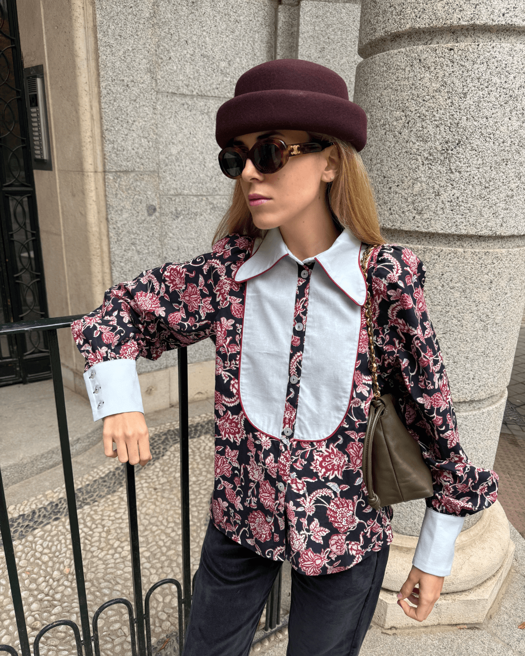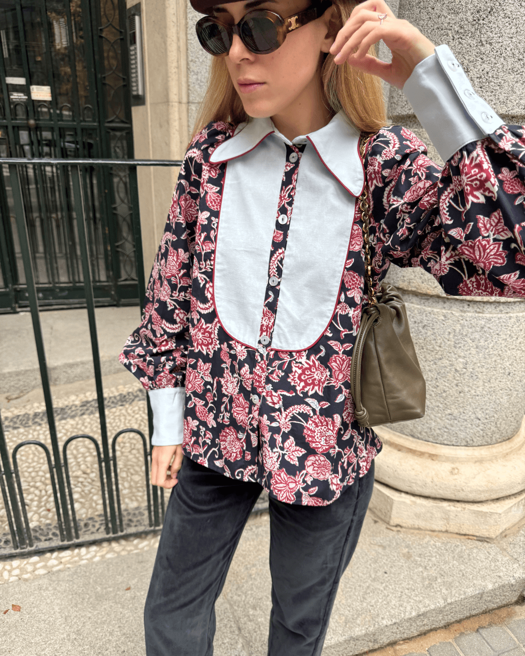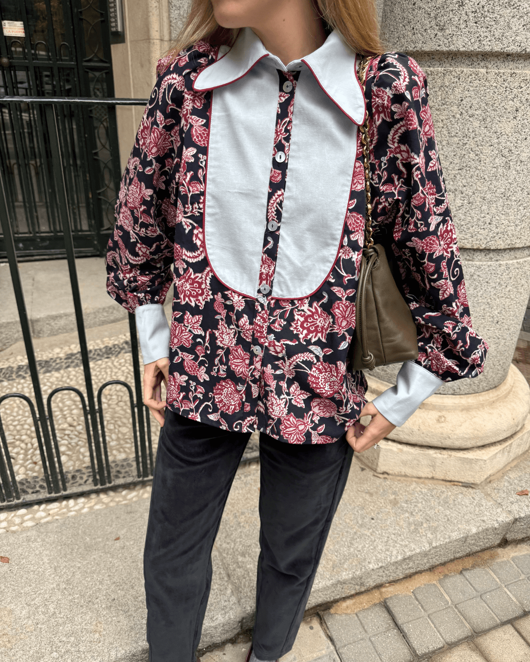 Detalles que Marcan la Diferencia: Te invitamos a que descubras los detalles de su confección: el cuello en pico más formal y refinado, el canesú, los vivos en color granate, las mangas abullonadas que ofrecen un volumen dramático que evoca la moda del siglo XIX y los puños con tablillas. Estos elementos hacen de esta prenda una garantía de originalidad, elegancia y estilo. Pero sobre todo es su estampado de flores estilo indiana y la pechera en contaste, lo que la hacen sin duda aún más especial.
