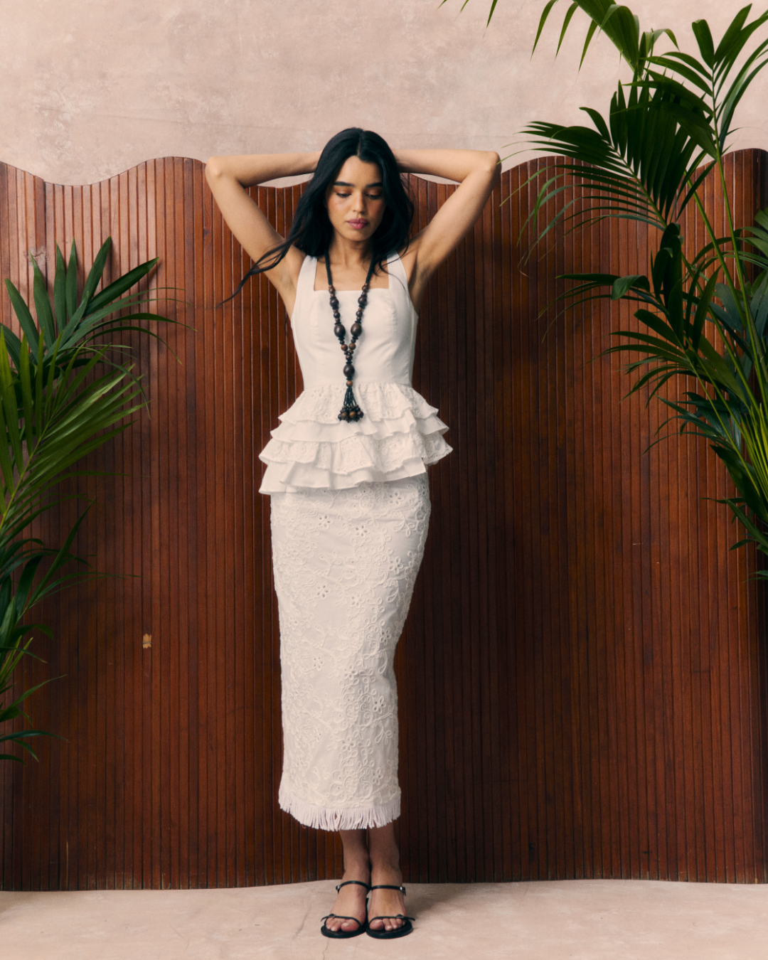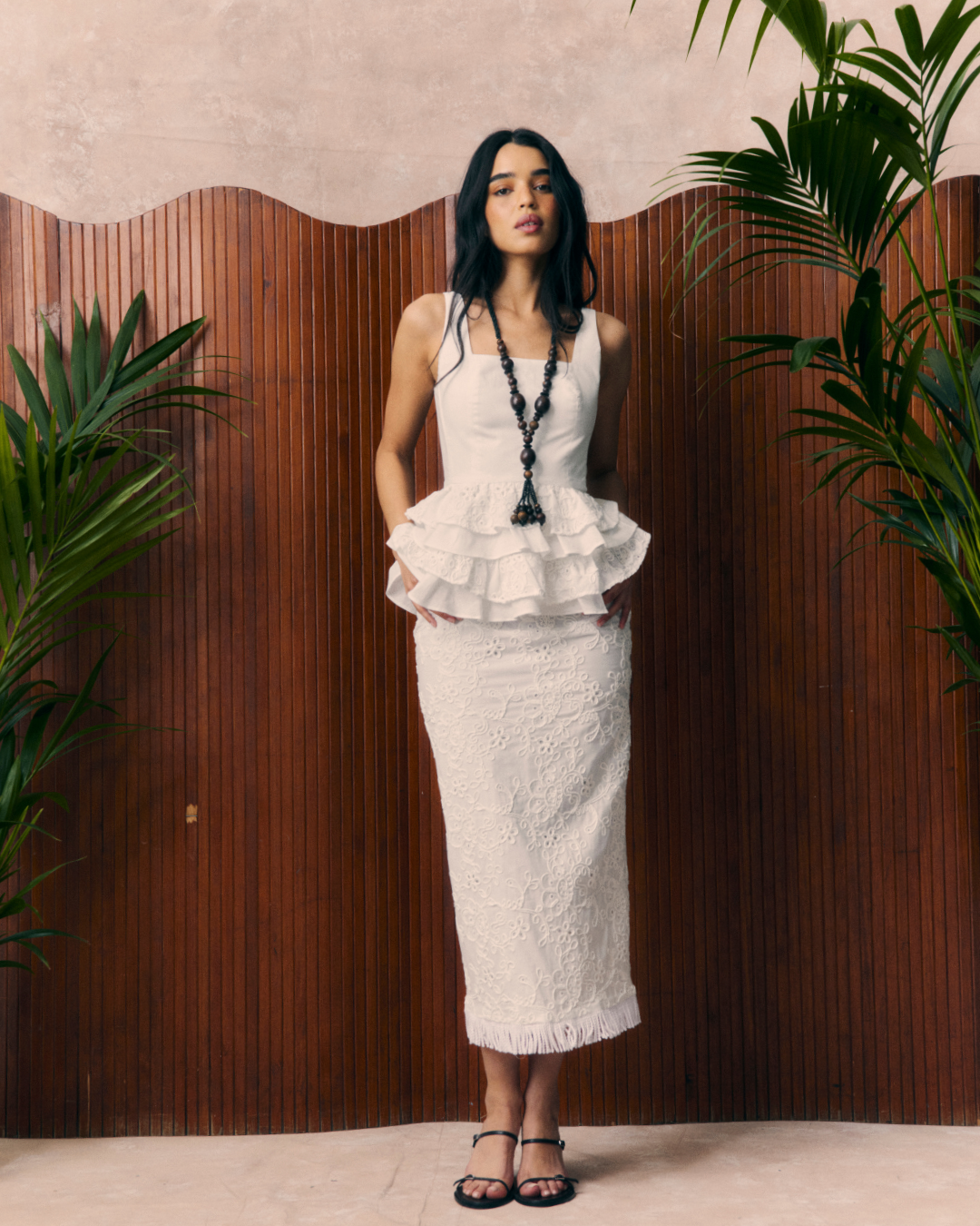 Detalles que Marcan la Diferencia: Su diseño entallado en el torso resalta la silueta mientras que el faldón de volantes aporta dinamismo. Sus tirantes anchos aportan un mayor soporte y comodidad , su cuello con forma cuadrada alarga el cuello y realza el escote, y su cuerpo estructurado moldea la silueta y estiliza la cintura. Pero lo que de verdad llama la atención son sus volantes fruncidos e irregulares, que aportan fluidez y ligereza. Su original tejido bordado en color blanco lo hace todavía más especial. Se trata de un estampado bordado, donde los motivos florales aportan textura y sofisticación atemporal, ideal para quienes buscan un look con personalidad. Confeccionado en un algodón de la mejor calidad, ligero y fluido, este top garantiza comodidad y frescura en cada uso.
