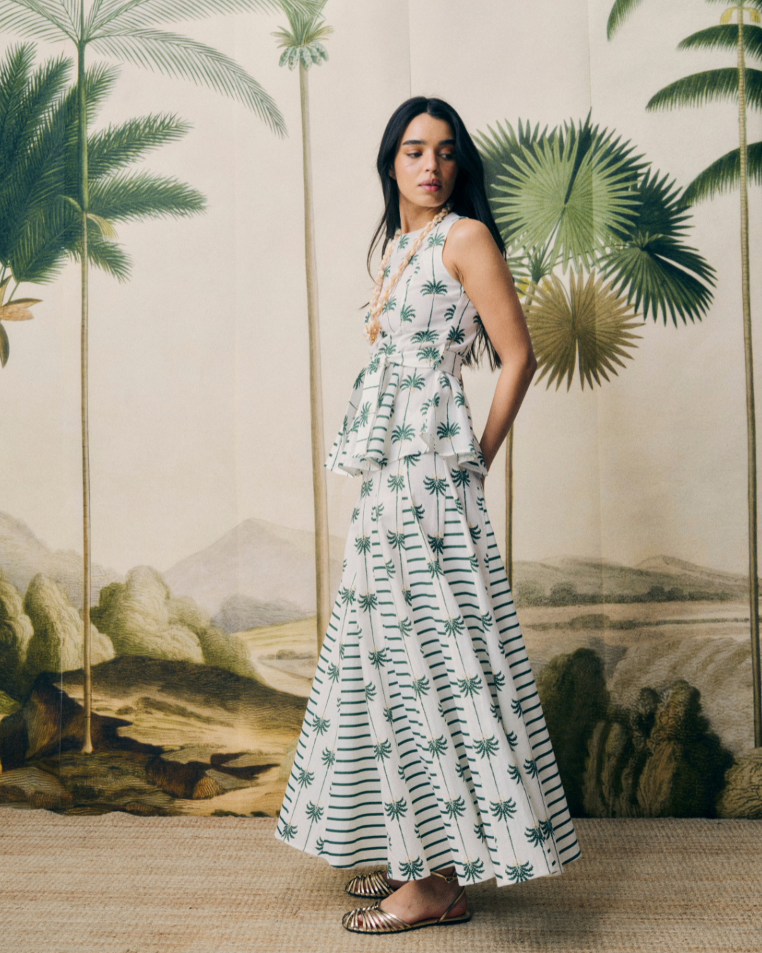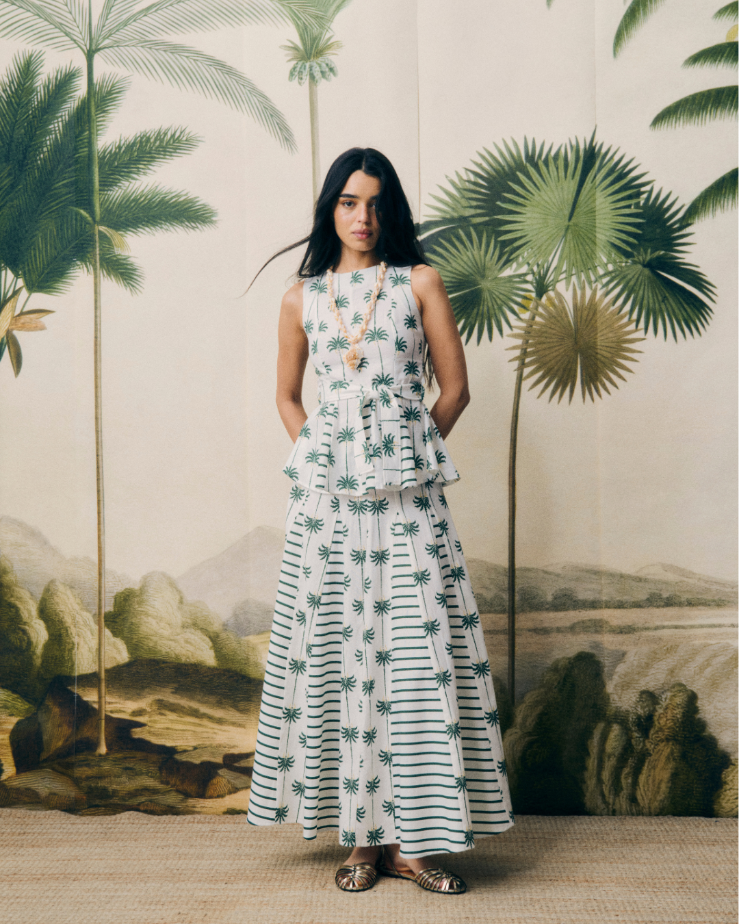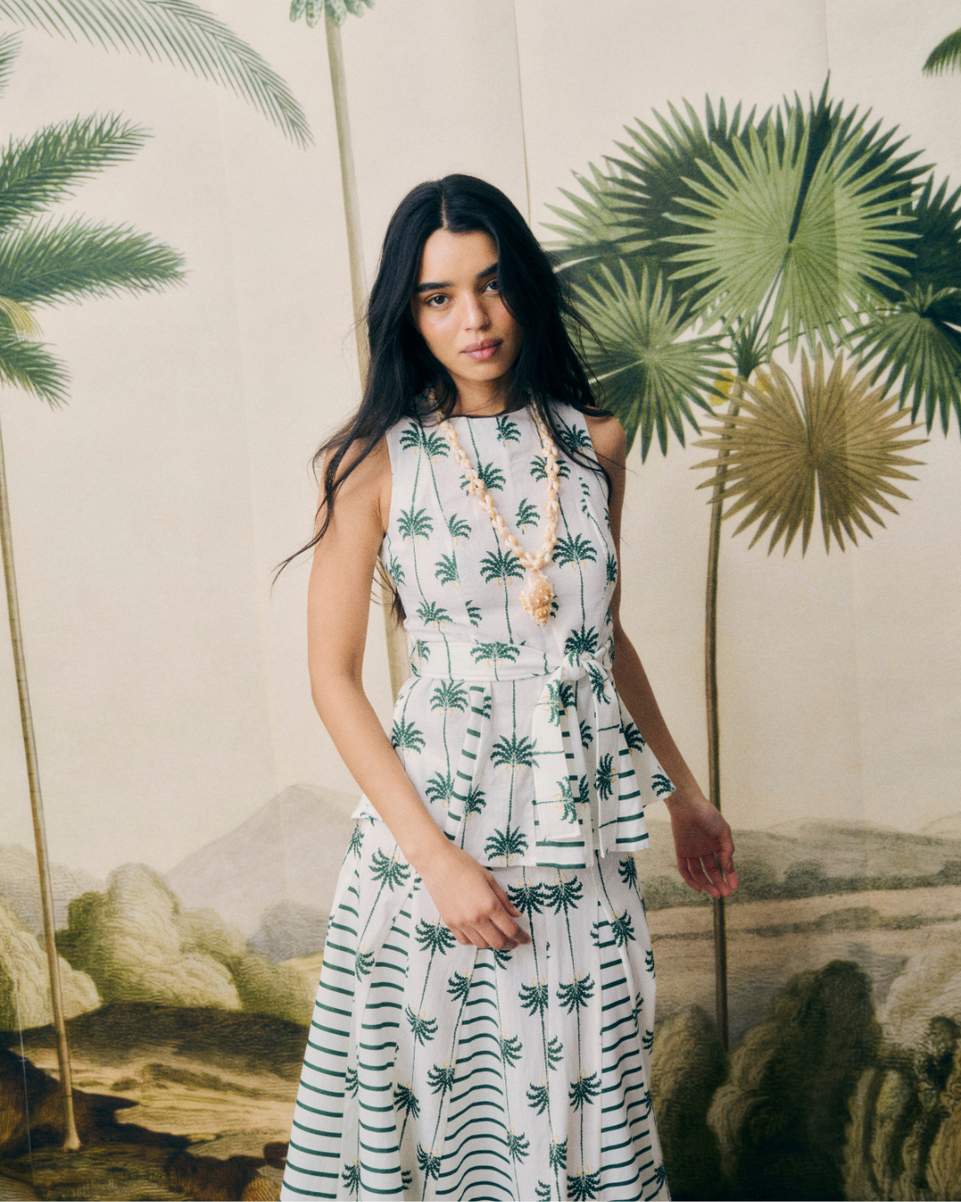 Detalles que Marcan la Diferencia: Con un diseño de líneas limpias y estructura fluida, este top de corte recto y sin mangas se adapta a cualquier ocasión. Su cinturón ajustable que realza la figura y añade un toque femenino, marca la diferencia, pero lo que de verdad llama la atención son sus godets, que aportan fluidez, ligereza y sientan bien a todo tipo de cuerpos. Su estampado de rayas verticales en tonos verdes y blancos combinadas con palmeras, diseñado por nosotras, aportan un aire sofisticado a la vez que hacen de este top una opción versátil para looks tanto casuales como formales.