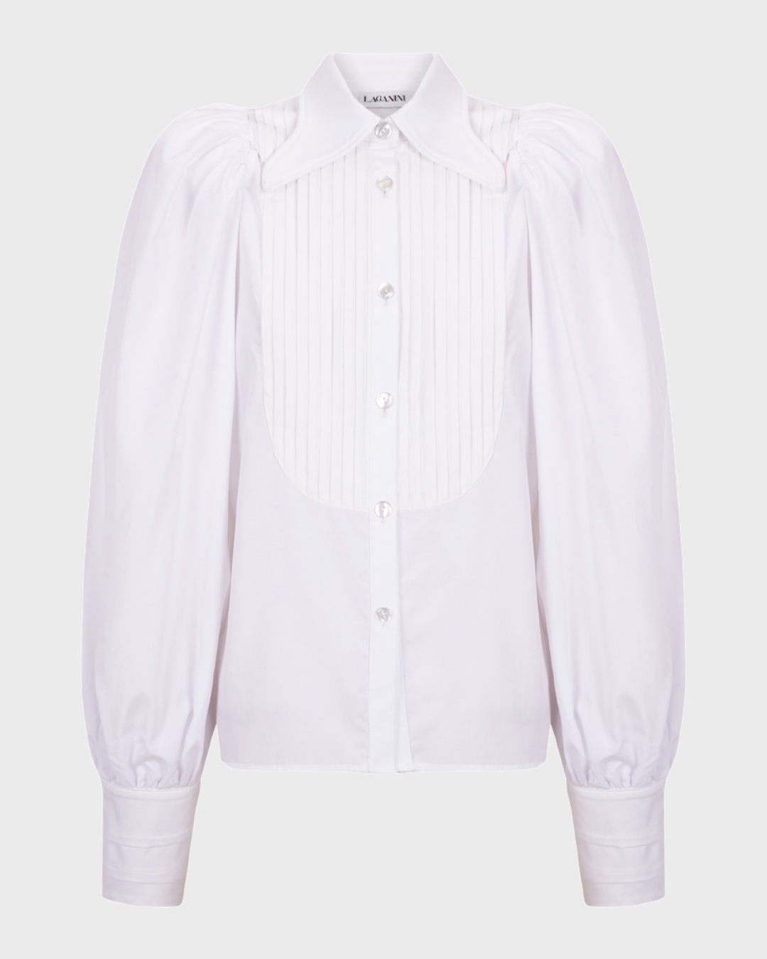 Detalles que Marcan la Diferencia: Te invitamos a que descubras los detalles de su confección: el cuello en pico más formal y refinado, el canesú, las mangas abullonadas que ofrecen un volumen dramático que evoca la moda del siglo XIX y los puños con tablillas. Estos elementos hacen de esta prenda una garantía de originalidad, elegancia y estilo. Pero sobre todo es el pecho terminado con un tejido plisado lo que la hacen sin duda aún más especial.